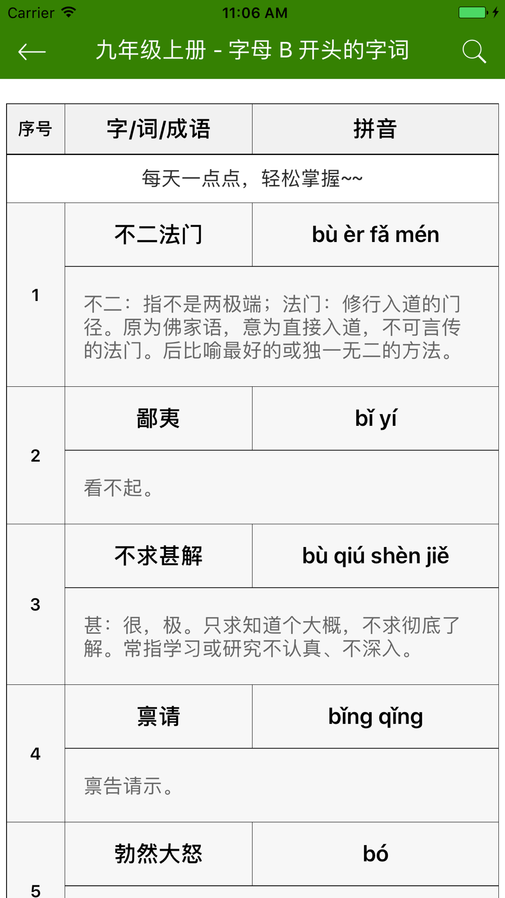 初三年级语文生字词大全包括了九年级语文上册和九年级语文下册课文课后所有生字词及成语,是初三年级学生必需掌握的字词拼音释义,也是九年级语文单元测试及综合测试必考内容,在这里,中学生可以非常方便地浏览、碎片化学习、每天学习一点点,轻松掌握初中语文必备生字词。
