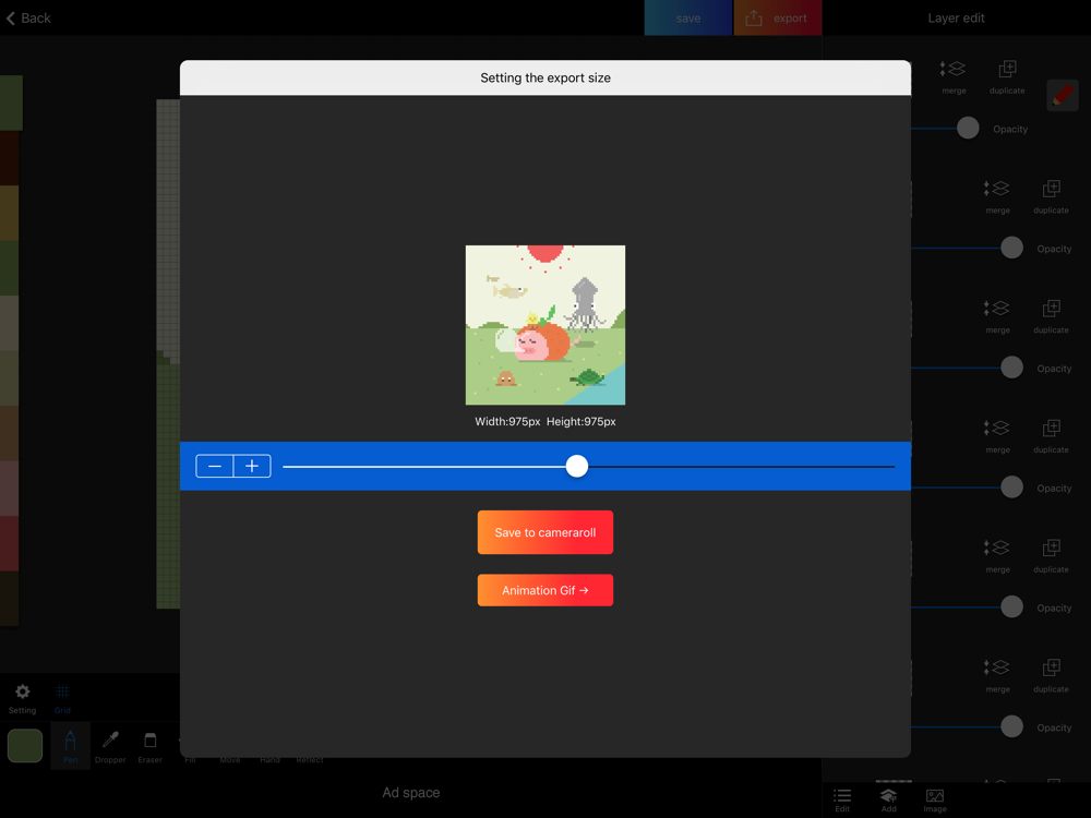 You can select exporting size. Pictures will be saved to camera roll as a png file.