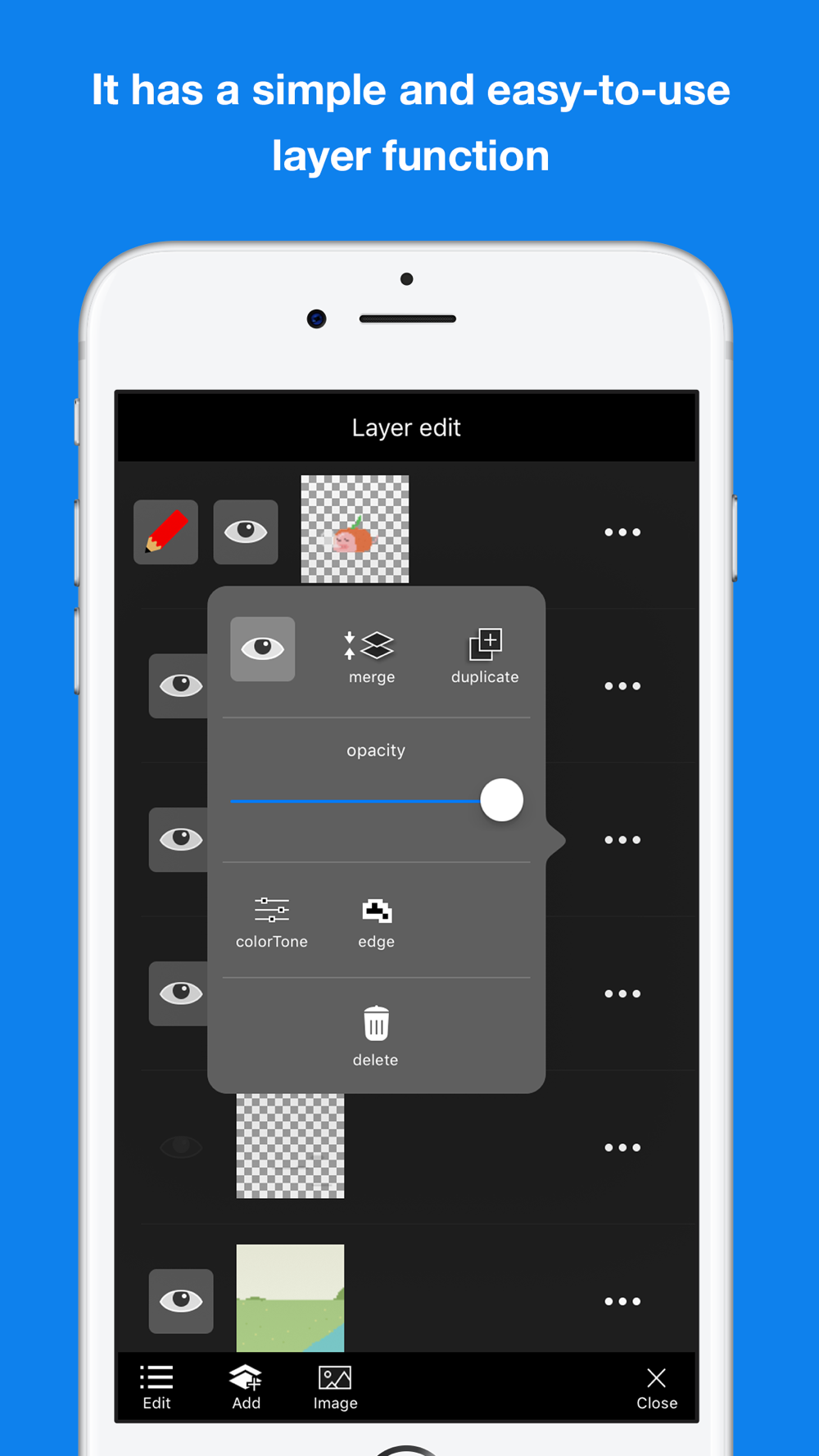 The app has genuine functions, like layer editing, color making, and various tools. Also, you can operate intuitively. For example you can enlarge and reduce the canvas by pinch in or pinch out.