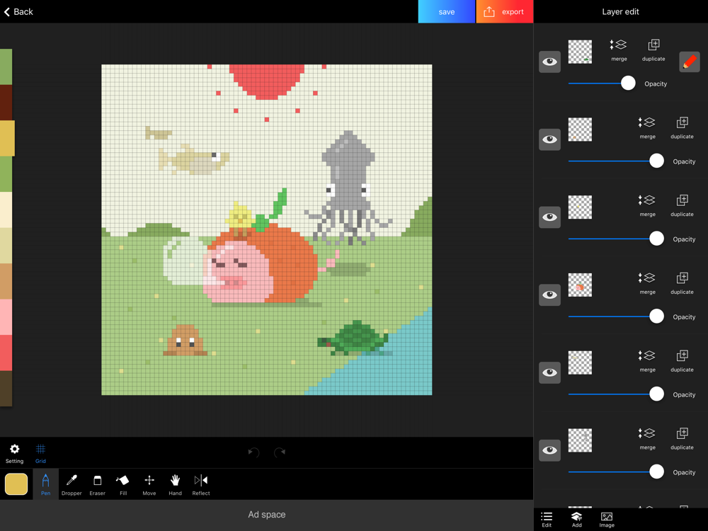 The app has basic tools to draw pixel arts. (For example, pen, spuit, filling and transfer)