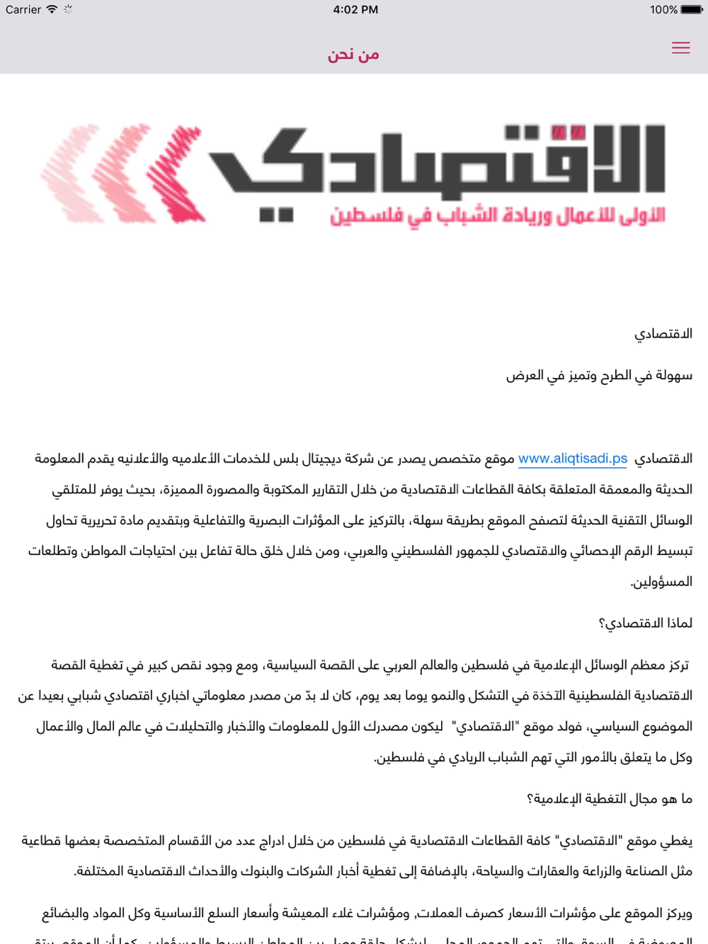الاقتصادي تطبيق متخصص يصدر عن شركة ديجيتال بلس للخدمات الإعلاميه والإعلانيه يقدم المعلومة الحديثة والمعمقة المتعلقة بكافة القطاعات الاقتصادية من خلال التقارير المكتوبة والمصورة المميزة، بحيث يوفر للمتلقي الوسائل التقنية الحديثة لتصفح التطبيق بطريقة سهلة، بالتركيز على المؤثرات البصرية والتفاعلية وبتقديم مادة تحريرية تحاول تبسيط الرقم الإحصائي والاقتصادي للجمهور الفلسطيني والعربي، ومن خلال خلق حالة تفاعل بين احتياجات المواطن وتطلعات المسؤولين.