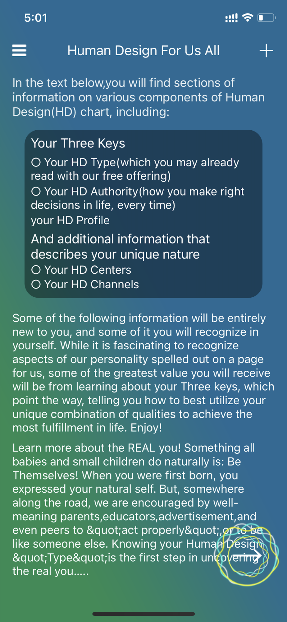 The Human Design app is an essential 21st Century tool for self-discovery and personal empowerment in these rapidly changing times. Its accuracy speaks for itself. It is startling as it reveals the most significant aspects of your personality and genetic inheritance.