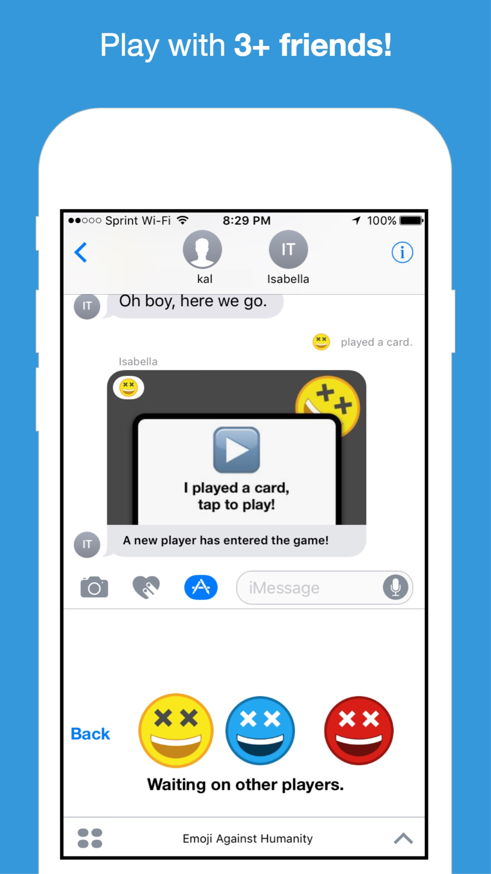 • Send that black card to 2+ friends in iMessage (This version of Emoji Against Humanity does not support you playing with yourself)