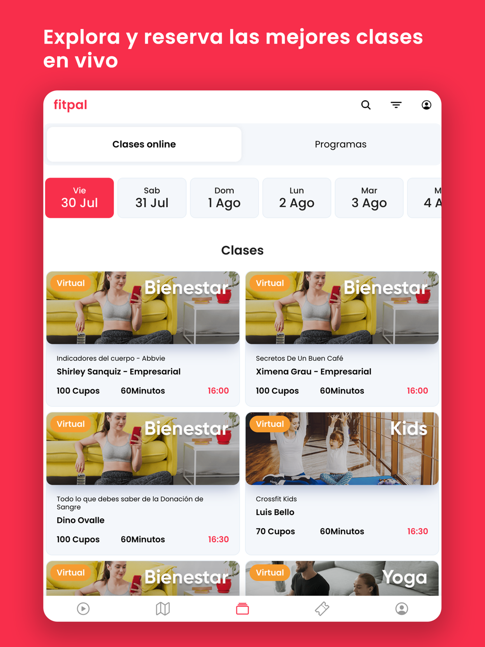 Fitpal es un pasaporte fitness que te permite reservar clases presenciales y/o virtuales en diferentes gimnasios. A partir de la versión 5.3.0 de la aplicación podrás conectar Fitpal con Apple Health y darnos solo permisos de lectura de pasos, distancia y actividad física, para que así puedas participar en todos nuestros retos.