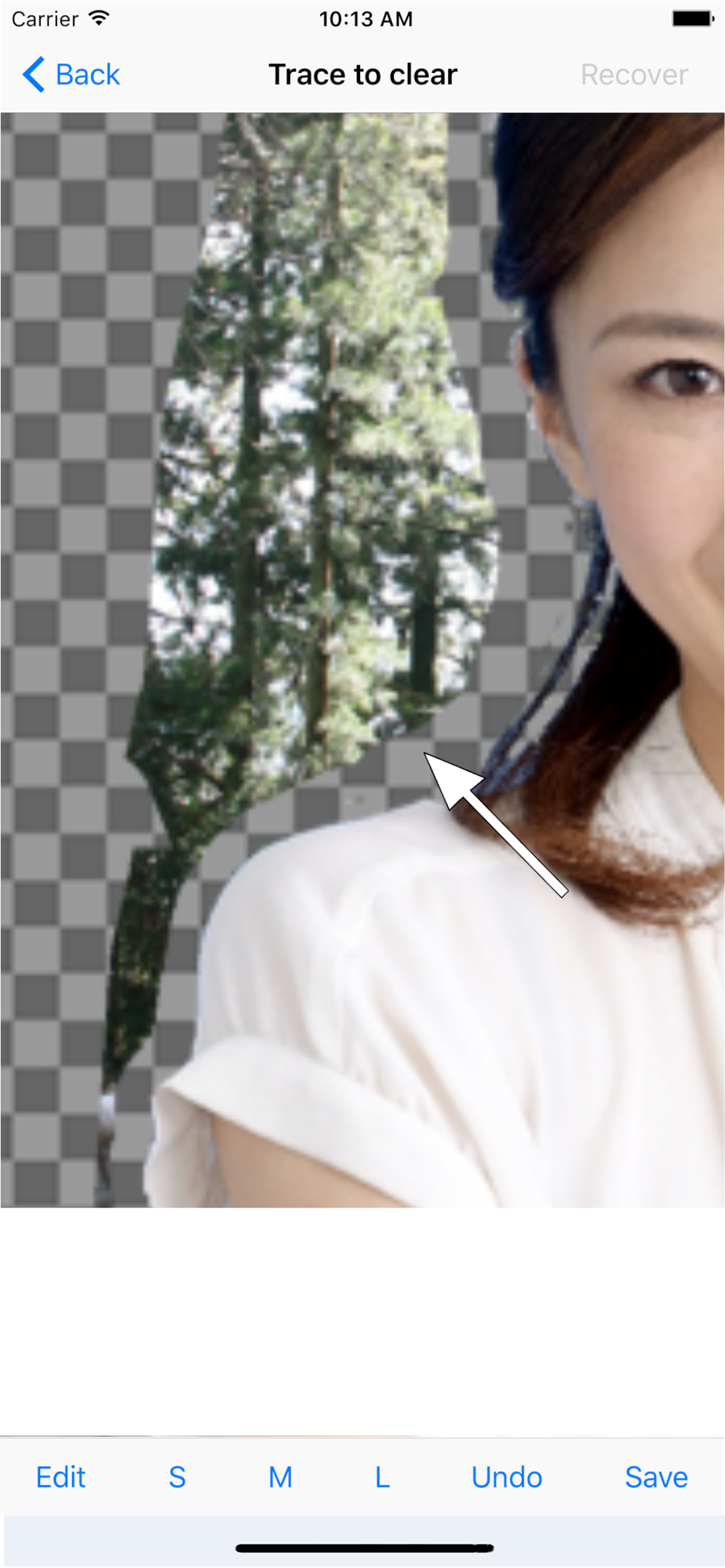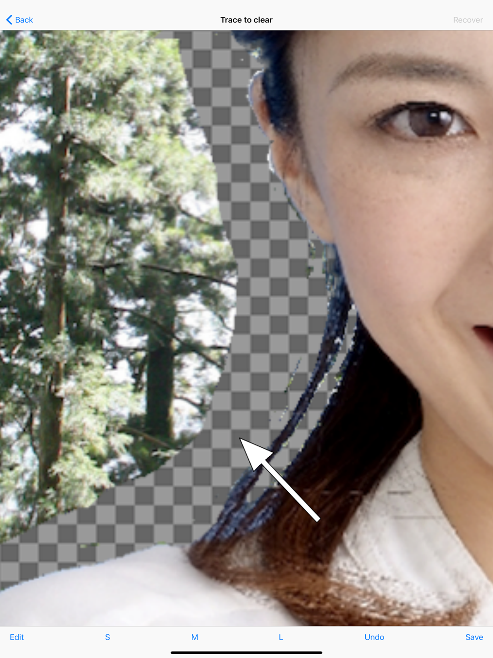 You can restore any part of the transparency part with the background transparency function. When you tap the “Recover” button, the transparent part turns to blue. Tracing this part with your finger will restore the original image.