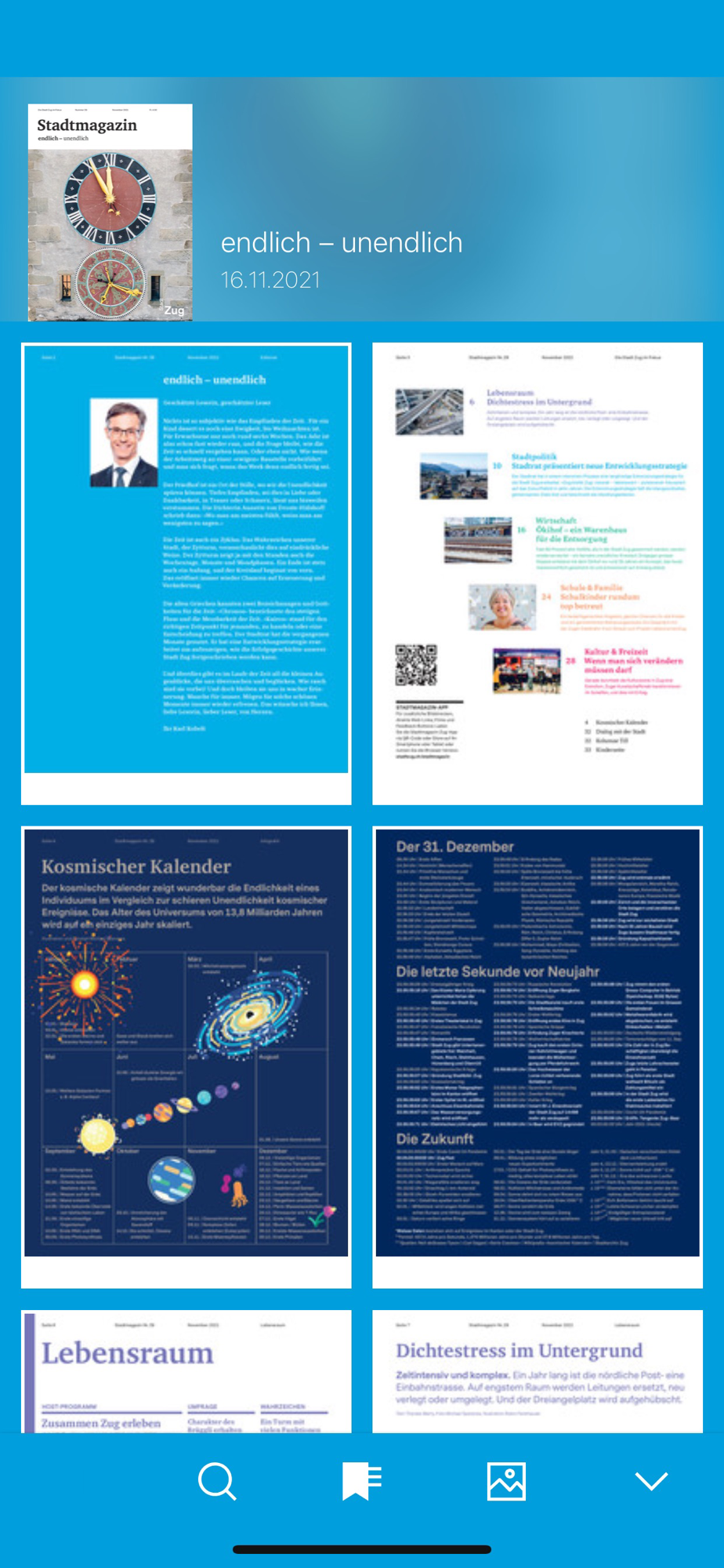Das Stadtmagazin erzählt Geschichten aus der Stadt Zug. Hintergründige Reportagen, spannende Fotostrecken, Kurzmeldungen aus Politik, Wirtschaft, Kultur & Freizeit, Schule & Familie, Hinweise auf städtische Veranstaltungen – das und noch viel mehr finden Sie im Stadtmagazin. In der digitalen Version auf ihrem Smartphone, Tablet oder im Browser gibt’s die aktuellsten Ausgaben des Stadtmagazins angereichert mit noch mehr Inhalten: Zusätzliche Bildstrecken, direkte Weblinks zu weiterführenden Infos, integrierte Filme, Videobeiträge, Tondokumente und erweiterte Interaktionsmöglichkeiten. Entdecken Sie Zug neu – mit der Stadtmagazin-App!