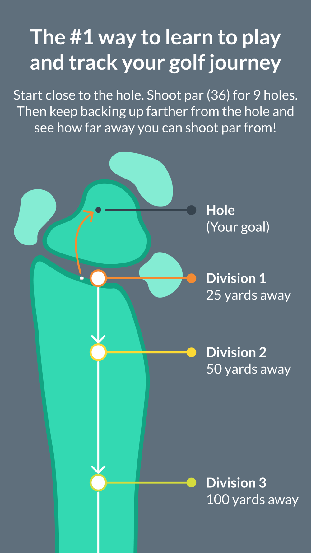 Operation 36 is the #1 way to learn to play golf and see measurable improvement. Instead of starting at the full-tee box, golfers start 25 yards from the hole and try to shoot even par (score of 36) for 9 holes. Once you accomplish that goal, you back you up to the next division (50 yards from the hole). There are 10 divisions in total to try and shoot 36 from. It is that simple!