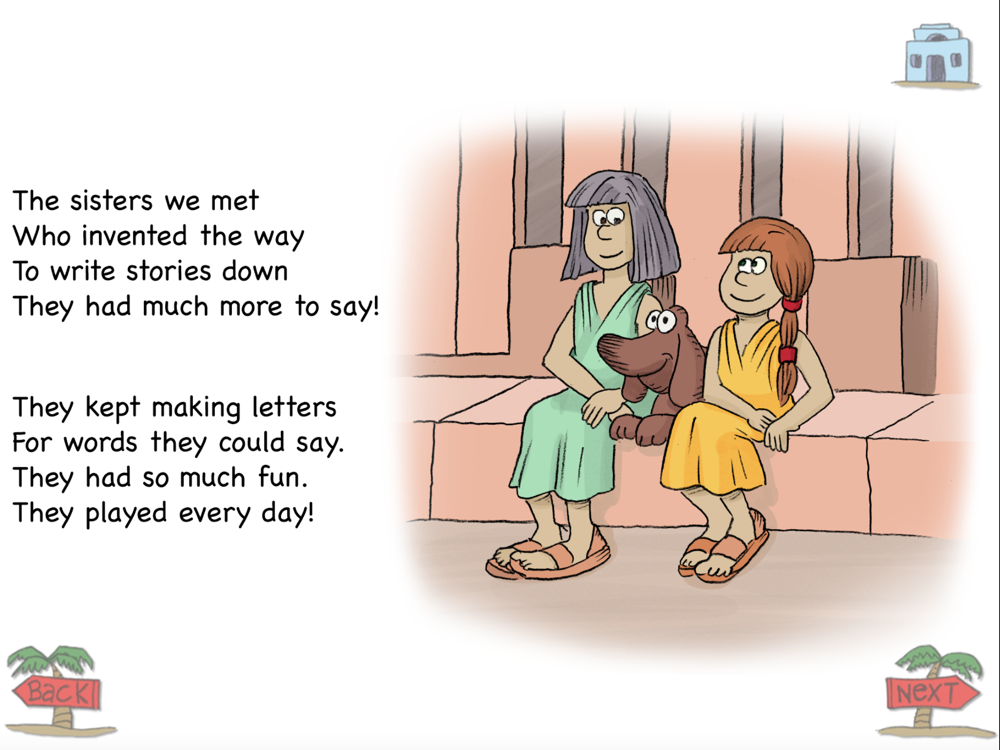 THE DANCING PIG is the 3rd of seven TALKING SHAPES apps that teach 36 sounds of English, the letters that represent them, and words that can be built with them. The ongoing storyline is about two sisters (“long, long ago”) who invent letters in order to remember the stories they love. THE DANCING PIG adds to what was learned in TALKING SHAPES1&2 by teaching 6 more letters (I, G, B, D, J, W) and 7 phonemes: (“j”, “g” “b”, “d”, “i”, “w”, “I” as in HI) and 15 KEY WORDS: FIG, IS, HIS, FIT, SIT, HIT, IT, PIT, BIT, BAT, PAT, DID, BAD, PIN, DAD, with an interactive story and games. Talking Shapes 4-7 teach the rest of the 40 sounds of English and words that can be built with their letters.