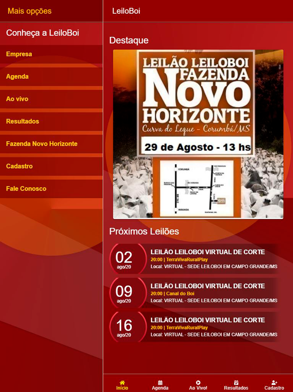 Em 2013, a Leiloboi adquiriu a fazenda Novo Horizonte, localizada na Curva do Leque, em Corumbá, para dar continuidade ao desenvolvimento da região, com modernidade e profissionalismo.O LEILÃO LEILOBOI FAZENDA NOVO HORIZONTE, acontece todo último sábado do mês, atingindo a marca de 42.000 animais ofertados em 2014, com 100% de liquidez.