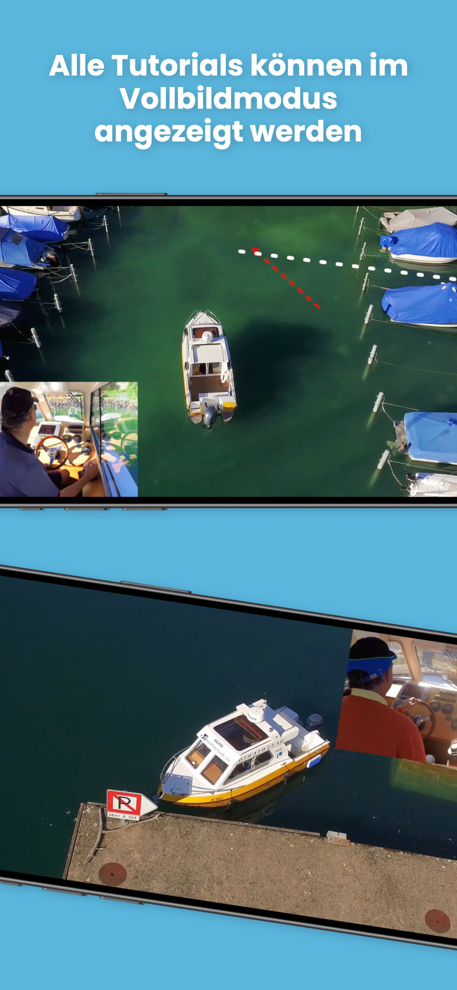 Folgende Tutorials und Hafenmanöver gefilmt aus der Vogelperspektive in Hafenanlagen sind in der App enthalten:
