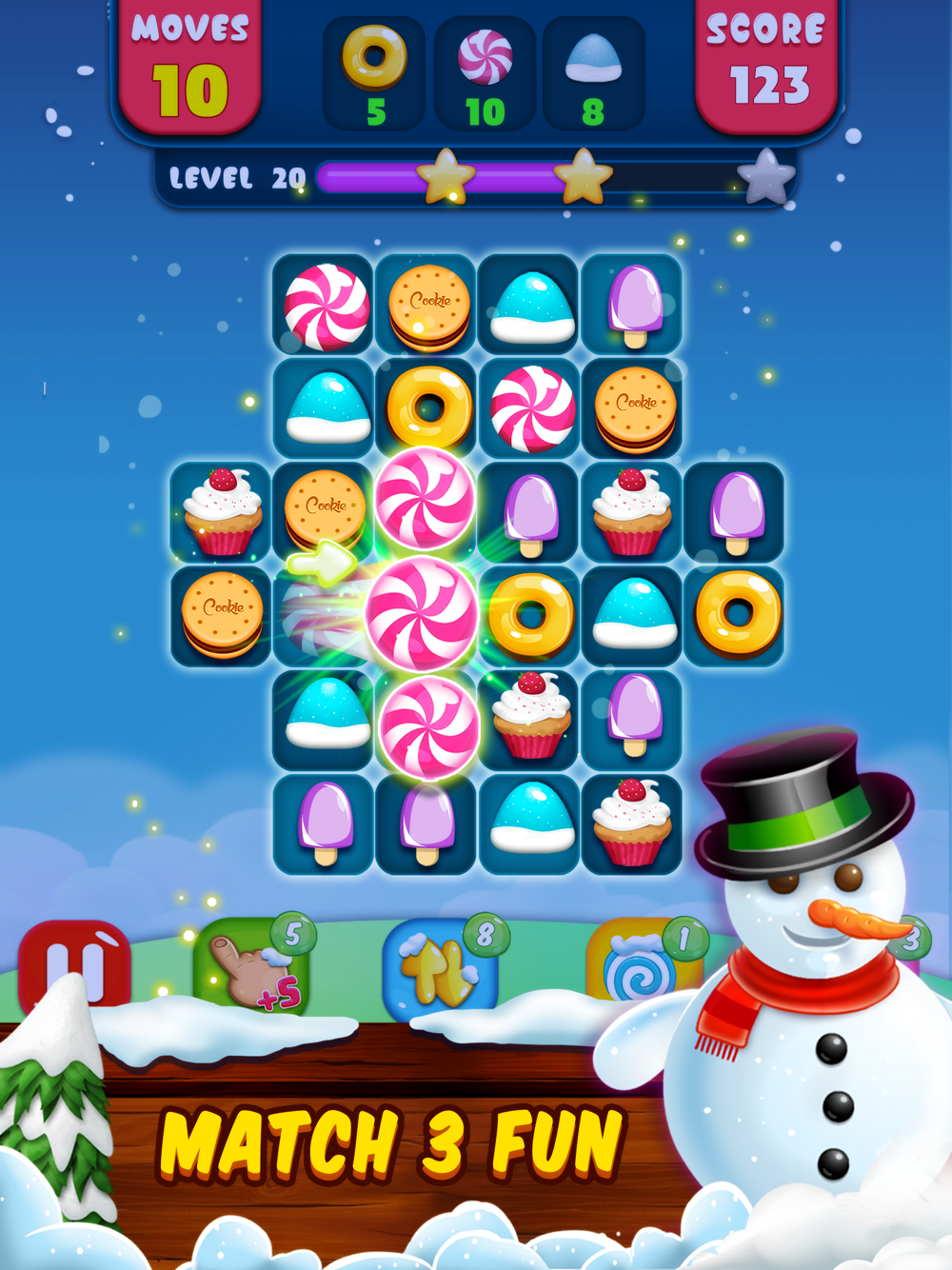 Swap and Match 3 or more cookies, cupcakes, donuts, jellies, lollipops, candies, Ice-cream, Santa hats, and similar properties to complete the fabulous levels.