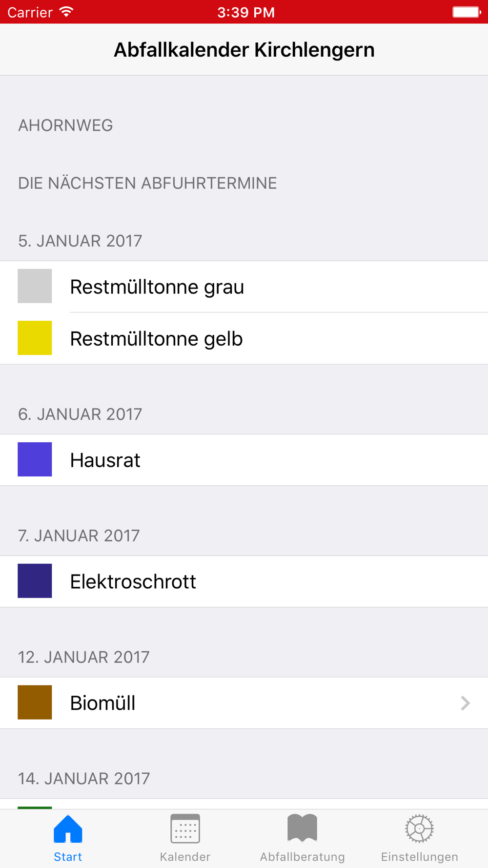 Auf der Startseite finden Sie eine Übersicht der kommenden Abfuhrtermine. Einen genauen Überblick über den gesamten Monat bietet die Kalenderfunktion.