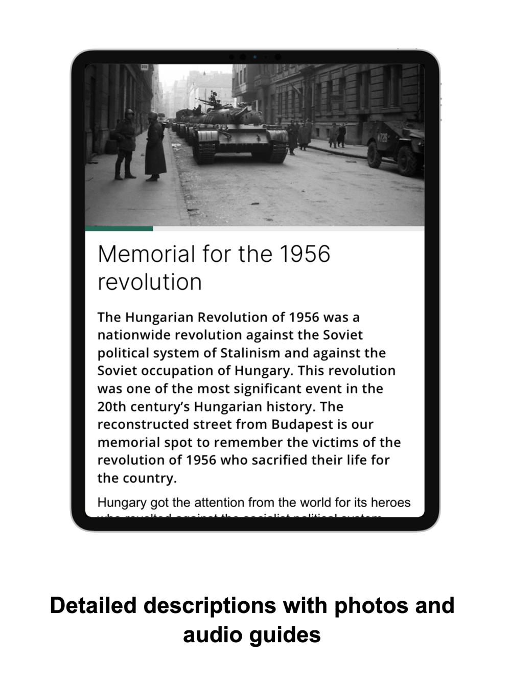 Complex multimedia guided tours provide users of the application with special and additional information based on their current position. With the help of videos, they can get an insight into the everyday life of trench fights, listen to the story of Don’s breakthrough at the chapel, and learn about the details of the T55 at the ’56 memorial.
