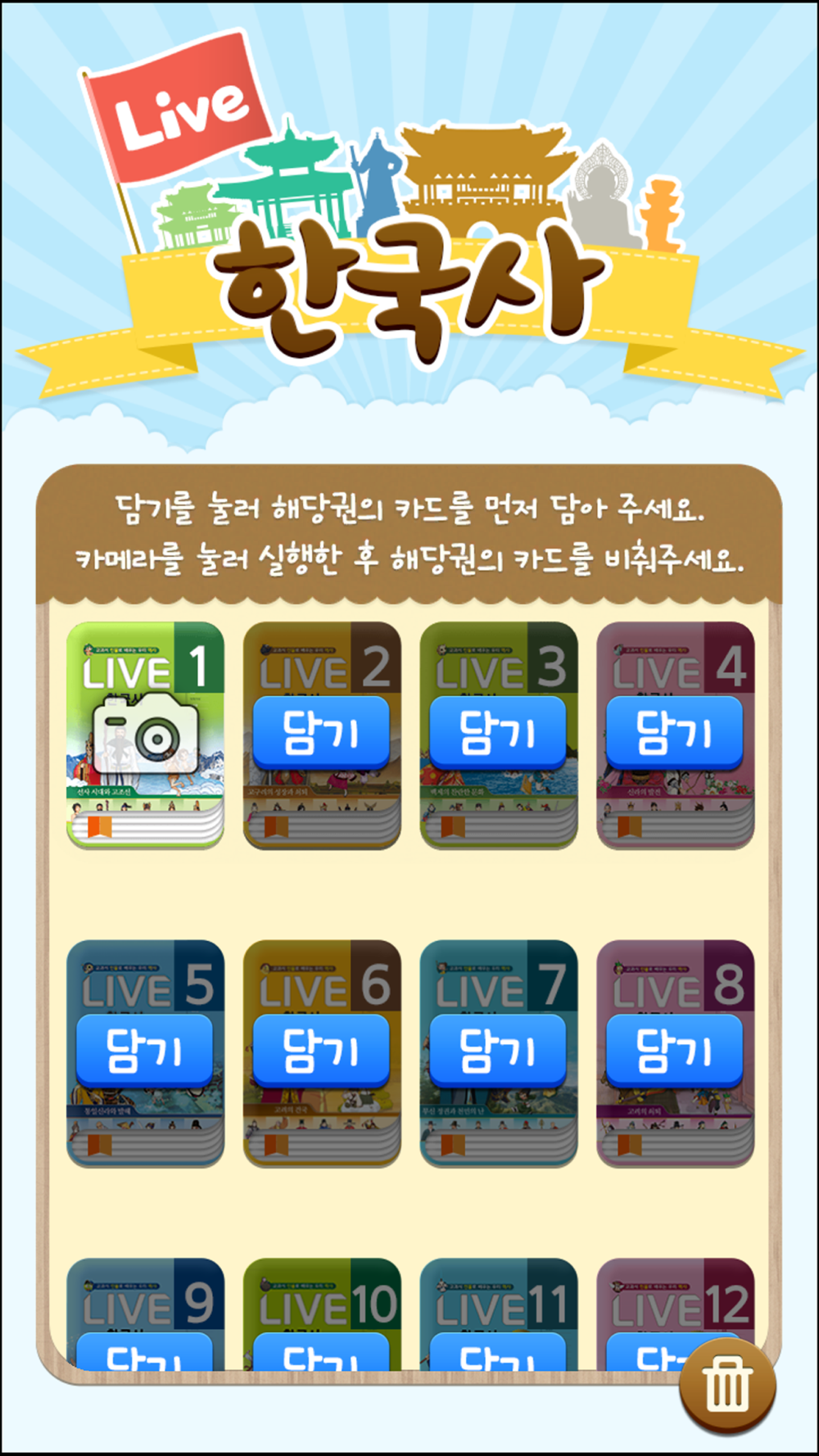 라이브 한국사 앱은 학습만화 '라이브 한국사'의 부록인 동영상 역사카드를 재생하기 위해 만들어진 앱입니다.