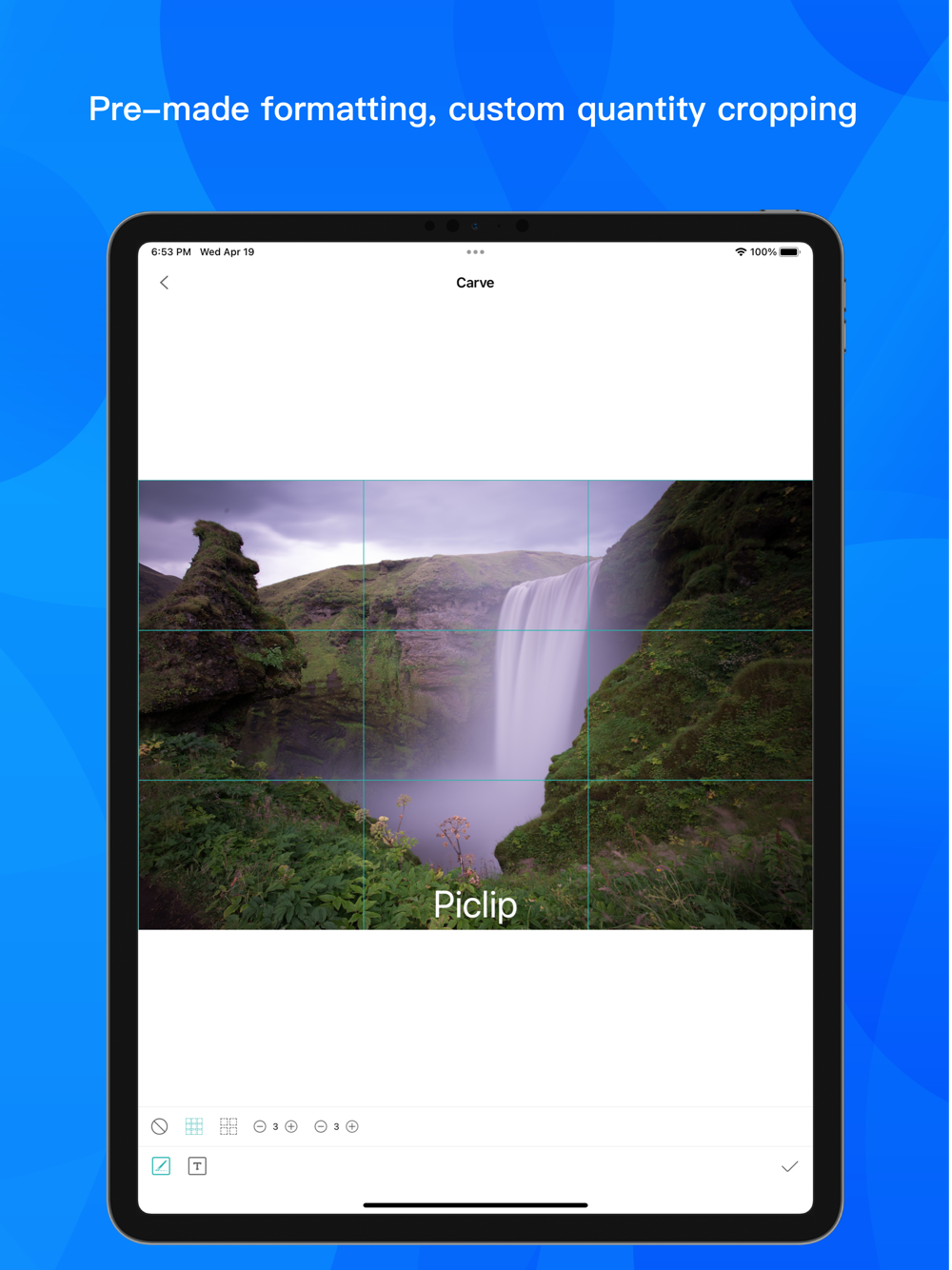 Piclip supports adding watermarks, nine-square grids (four-square grids, etc.), and a custom number of cuts to a picture, and these cut pictures will be saved in the album in order, and can be published on social platforms such as Weibo, Moments, Twitter, Facebook, Instagram, etc., to get a very interesting dynamic article display style.