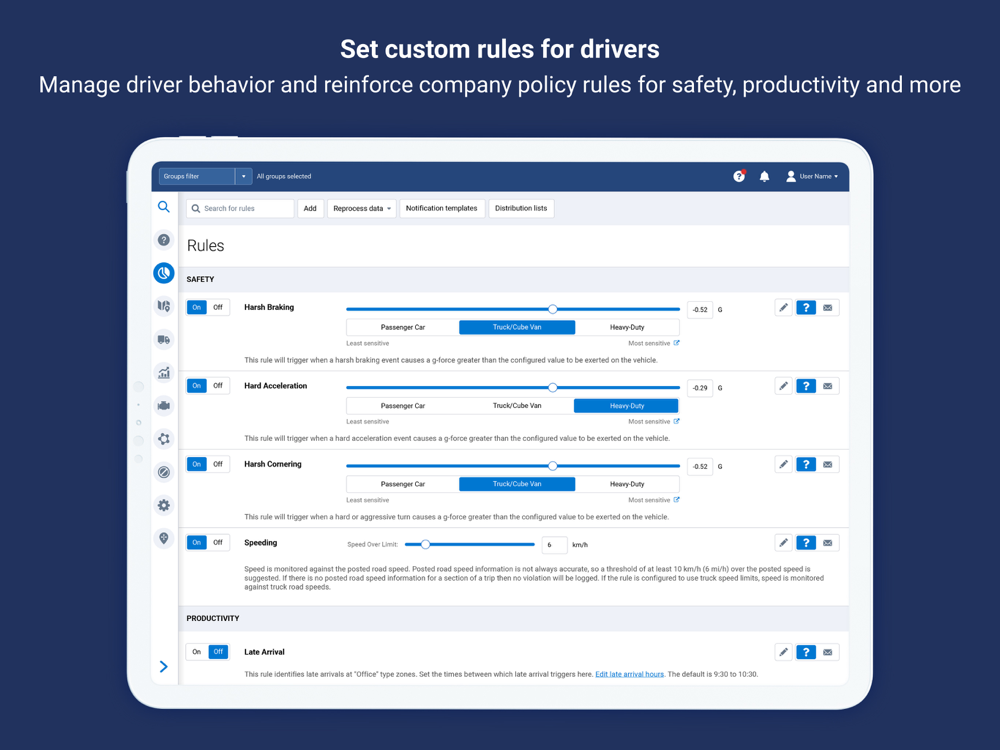 Track real-time GPS location on the live map and see a detailed Trips history for each vehicle. Set custom business rules and notifications for location, activity, speeding, hard braking, and seat belt use.