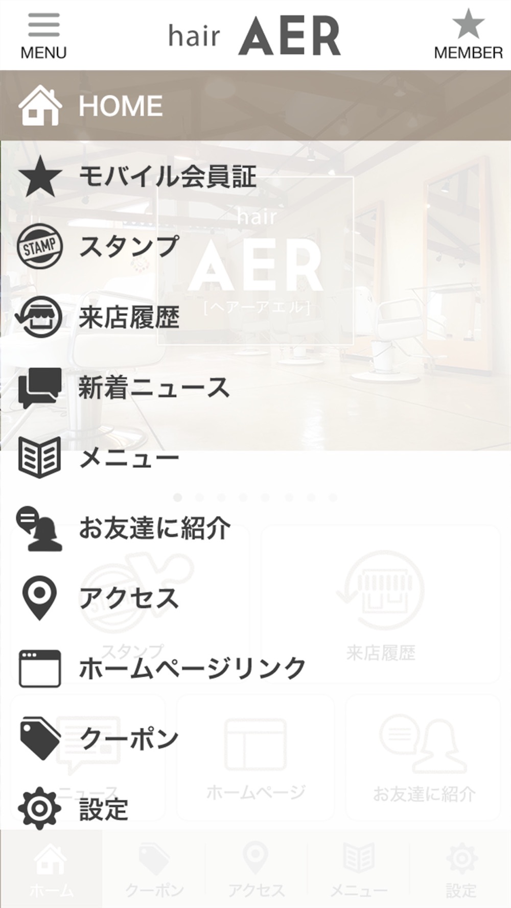 このアプリでは、hair AER(ヘアーアエルの色々な情報やアプリユーザー限定のお得なサービスが手に入ります!