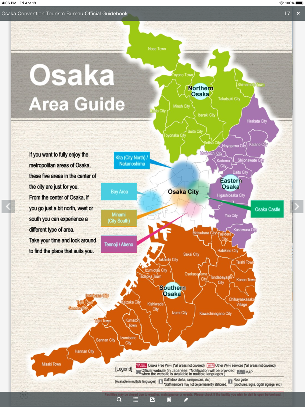 The Osaka Convention & Tourism Bureau’s Official Guidebook is packed with useful information about sightseeing in Osaka. Find information about the city and prefecture of Osaka by geographical area along with features describing interesting experiences you can have in the city under the heading “Great Osaka Experiences.” In addition, there are maps of sightseeing destinations and rail lines. You can also view the guidebook on your iPhone or iPad. You can even read and use it offline! Very useful!