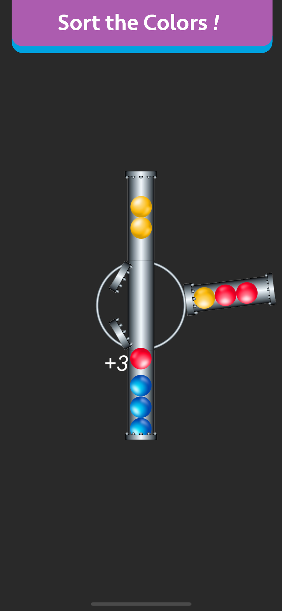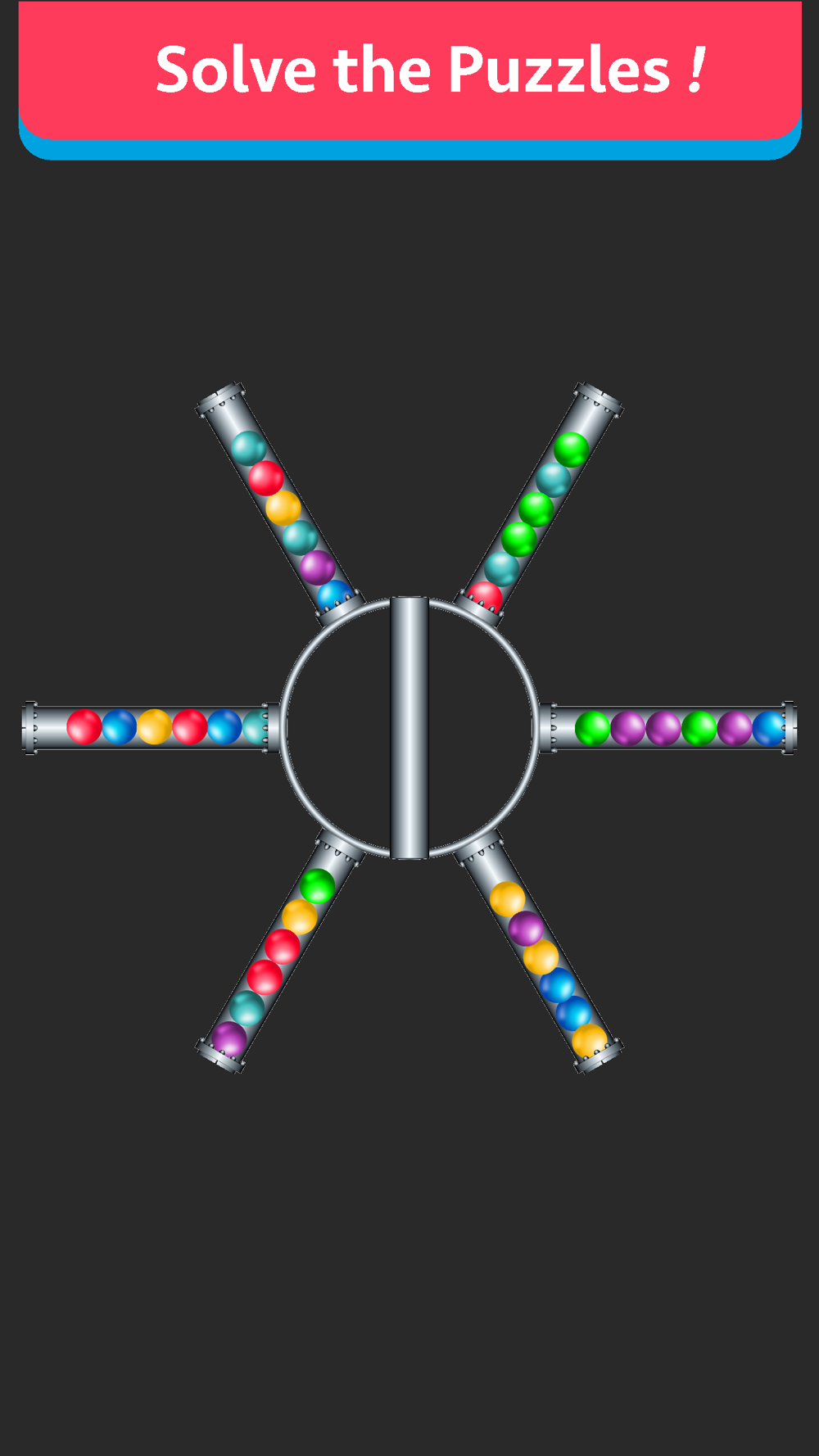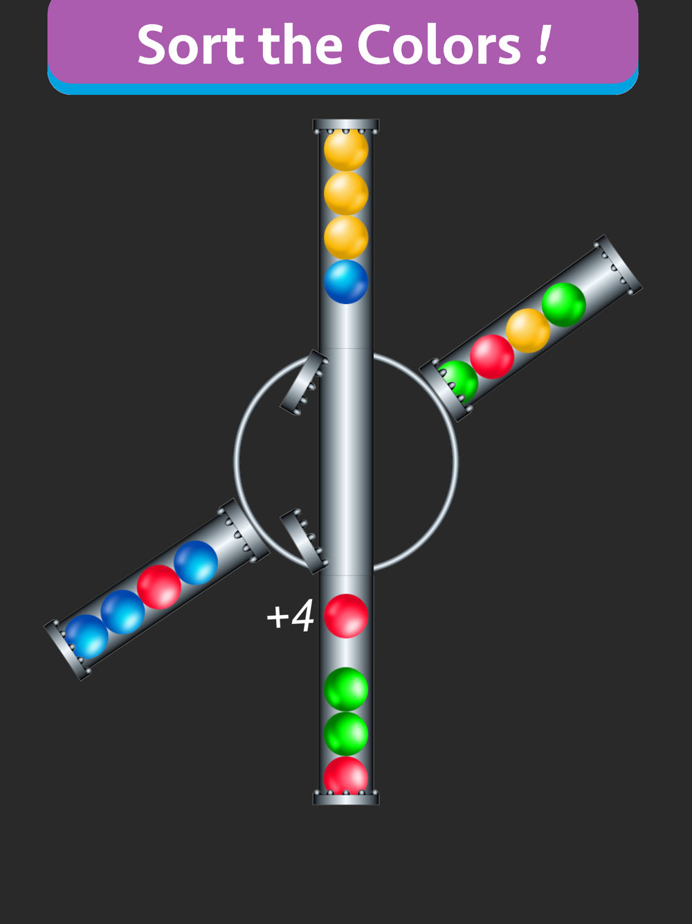 Beat the game by getting same color balls in all tubes! Move them by tapping one tube to go to the top and another to the bottom. If there's enough room in the bottom tube, the gate opens, the ball falls from the top tube to the bottom one.