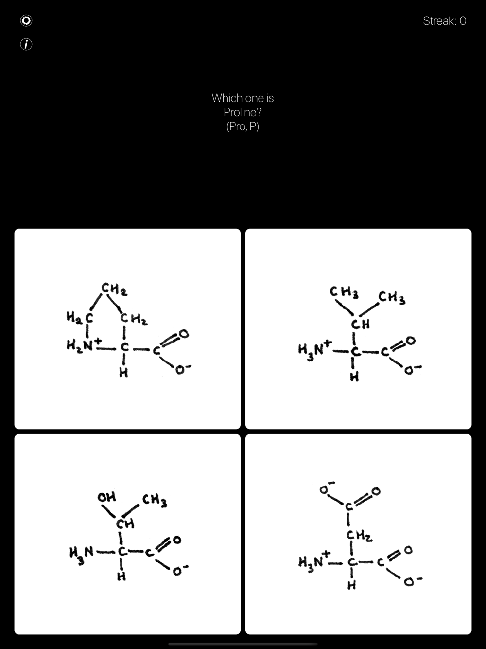 Amino Acid Academy is a simple flashcard-style learning tool to help you memorize the structures, names and codes of the 20 naturally-occurring amino acids.