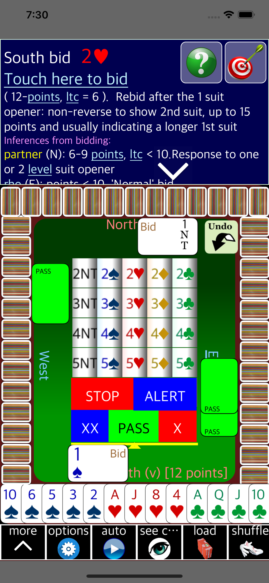 Learn bridge as a novice or improve your bridge as a seasoned player. Connect up with other duplicate bridge players. In-app purchases let you upgrade to the Pro version with a full choice of advanced bidding features. Optionally subscribe to remove ads. Use the "Upgrade" button in the HELP panel to access these subscriptions. Unlimited random deals are free. Download hands and double dummy results from your clubs BridgeWebs website. [Use option "Load"; then "Web search to find deals"; find your your club site; go to your results page; touch the "Hands" tab, then touch "Download as Pbn"]. Or use the preloaded CLUB-SESSION-SAMPLES to compare you play with actual results of a club session. Create your own deals [Use option "Load"; then "New Manual Deal" or "Amend Manual Deal"]. This app offers a choice of Standard American Yellow Card (SAYC), simplified Acol (EBU) system for beginners or Benji Acol. For any Pro bidding style, choose optional conventions: 5-card majors, Benji weak and strong twos, ELH two-suited overcall, ASPTRO 1NT defence or Landy 1NT defence, Roman Key Card Blackwood, standard Blackwood, Gerber, Quantitative 4NT, Baron 3C Normal Stayman or Puppet, Stayman, Jacoby 2NT 1-suit support, Truscott 2NT 1-suit doubled support, Ogust responses, Inverted minors, Unassuming Cue Bid, Splinter, Strong jump overcall, Weak take-out choices. There is also a choice of weak or strong 2-level opening bids for each suit, selection of preferred high card point ranges for weak or strong 1NT and 2NT bids and control of bidding aggression level during contested auctions. **Note for BEGINNERS and improvers: turn off any convention you do not recognise and set "aggression" to low. You will find the bidding easier to follow! Experienced players can make full use of the Convention Card wizard. If you find any problem or have queries / suggestions, please email Helen at
