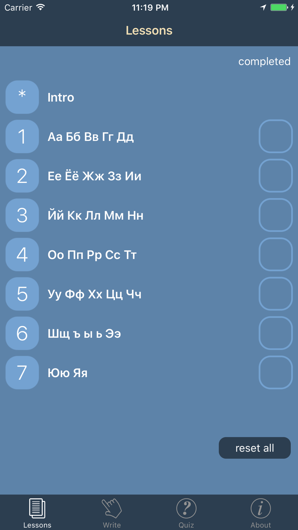 Russian Alphabet Now is a learning tool to help you learn to read and write the Russian Cyrillic alphabet. The entire alphabet is presented in 7 lessons that cover both print and cursive scripts. Includes sound for each letter names, pronunciation and a sample word.