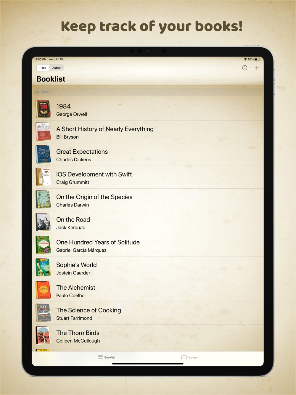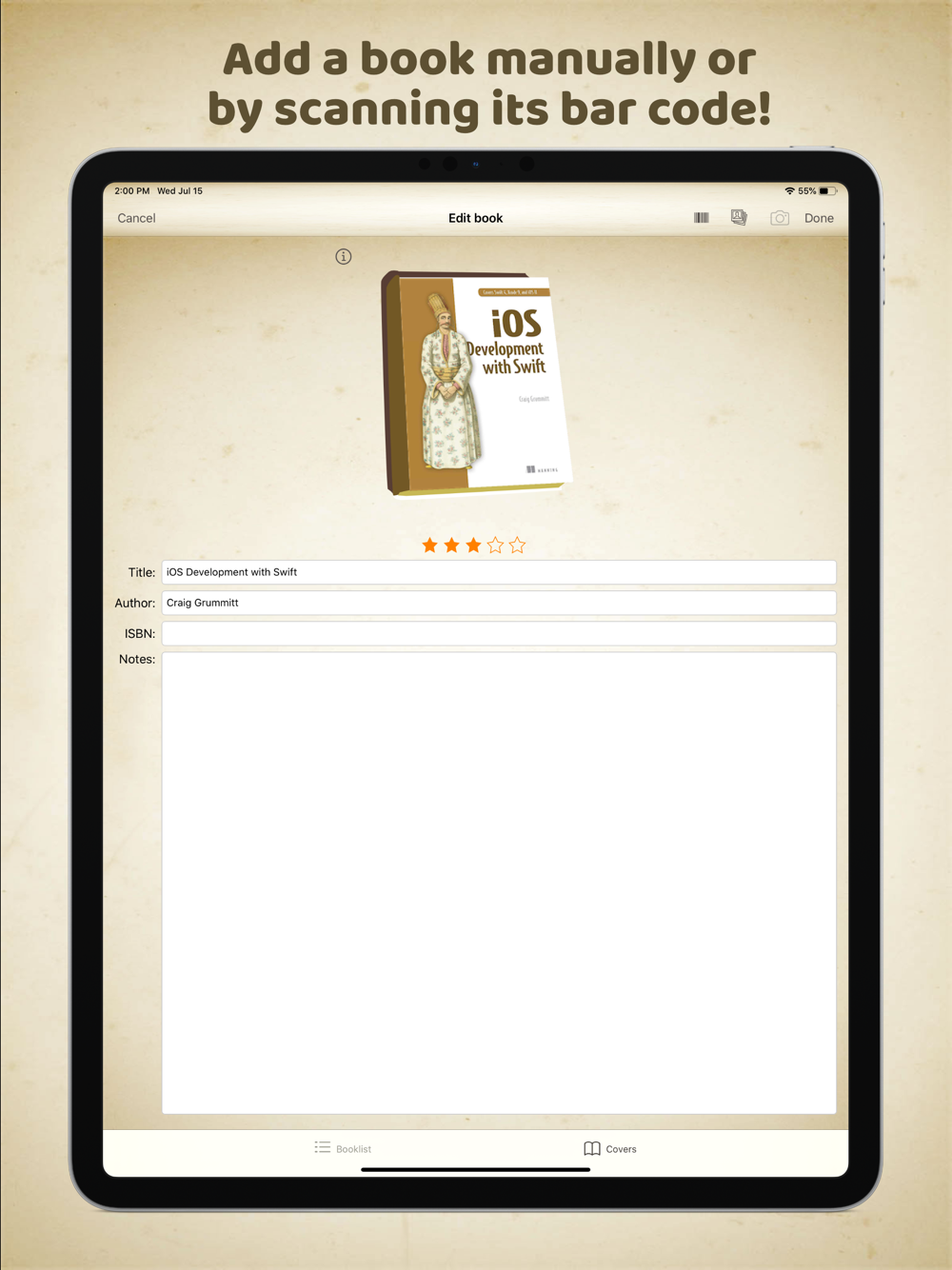 • Add title, author and cover art for your books manually or use the in-built ISBN scanner to automatically download.