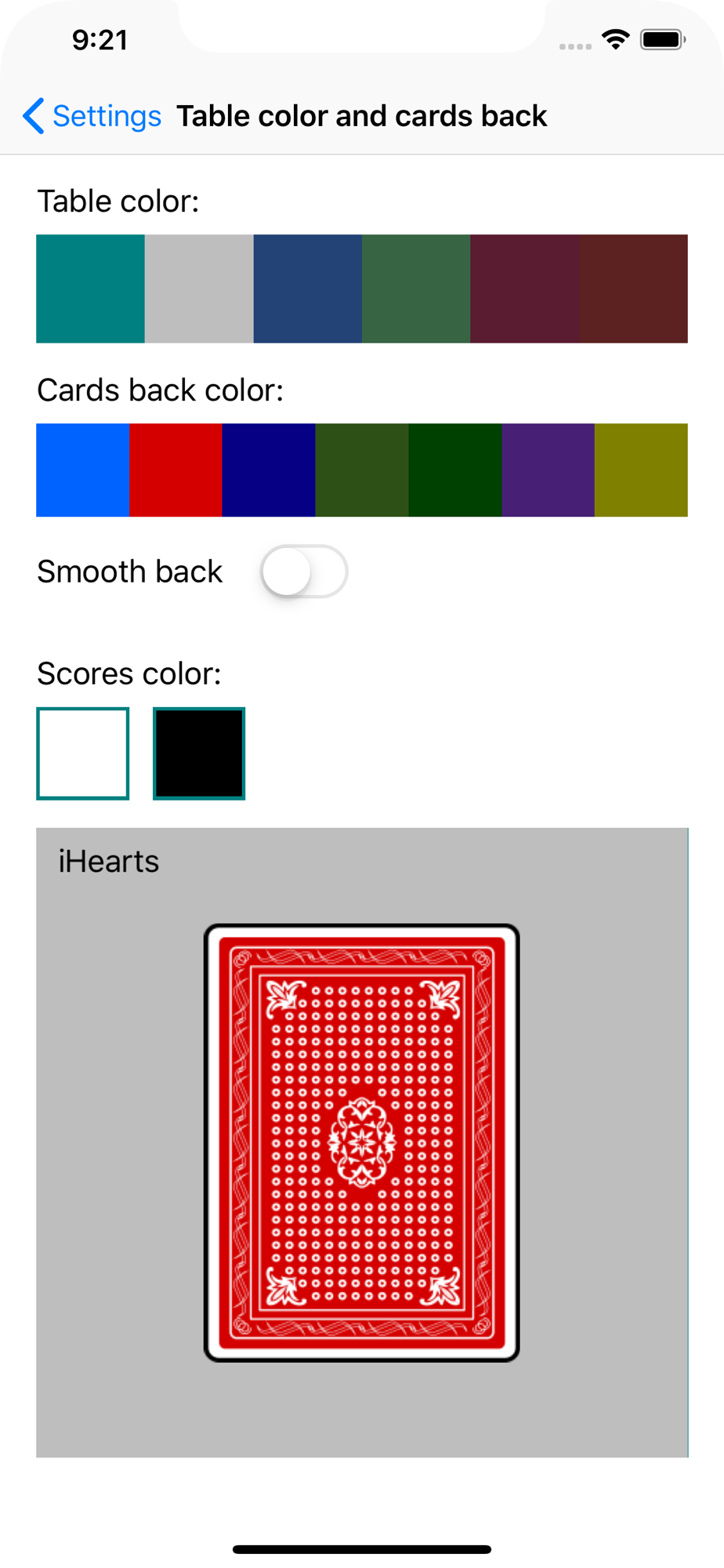 - Settings: Cards size, deck type (four-color or classic), cards back color, sound, animations, speed, scoreboard, table and scores color, see names on the table cards,...