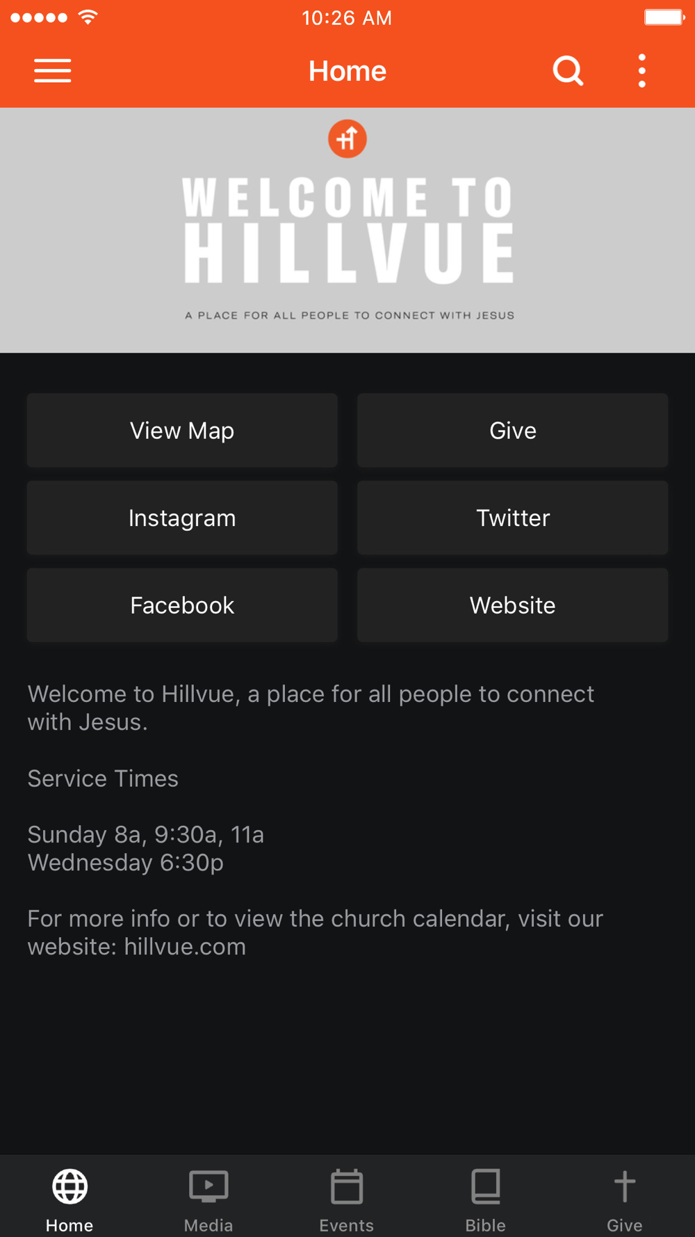 The Hillvue Heights Church App was created with the Subsplash App Platform.