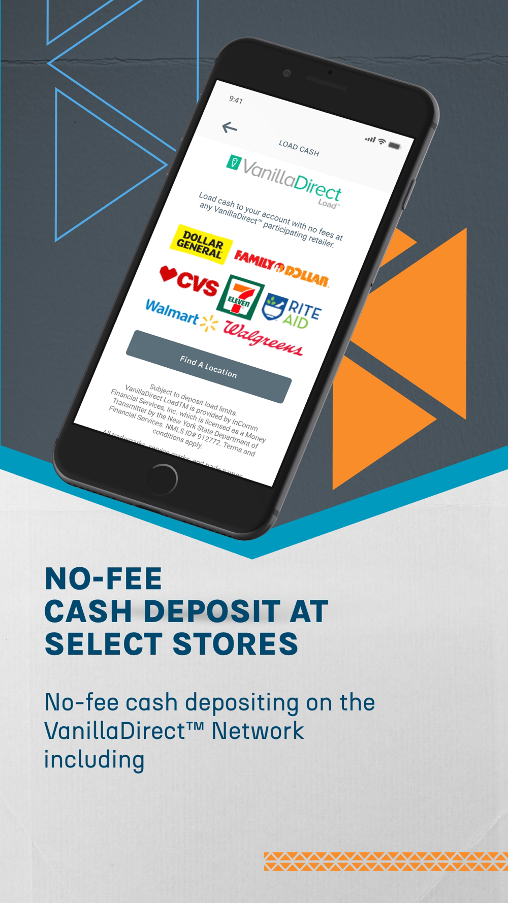 No-fee cash depositing on the VanillaDirect LoadTM 6 Network including Rite-Aid, Walgreens, Dollar General, and Family Dollar.