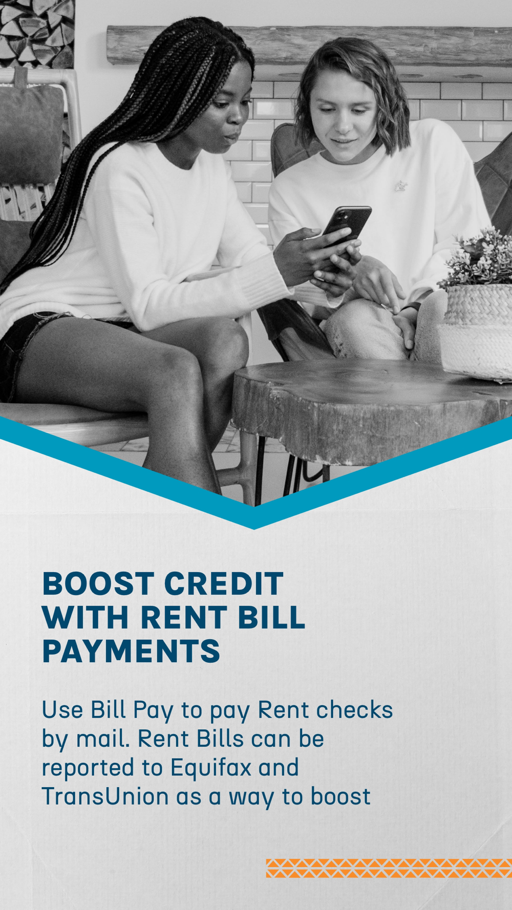 Use Bill Pay to pay Rent checks by mail. Rent Bills can be reported to Equifax and TransUnion as a way to boost your credit score with a positive payment history.