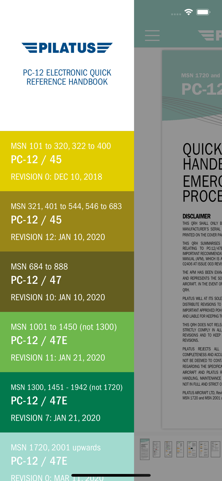 PILATUS REJECTS ALL AND ANY RESPONSIBILITY OR LIABILITY for the completeness and/or accuracy of the eQRH. This ELECTRONIC QUICK REFERENCE HANDBOOK does not contain and shall not be deemed to contain any representations, warranties and/or covenants regarding the specifications, performance and /or operation of the PC-12/45, PC-12/47 and PC-12/47E aircraft and PILATUS REJECTS ANY AND ALL LIABILITY with respect to any handling, maintenance and/or operation of the PC-12/45, PC-12/47 and PC-12/47E aircraft which is not in full and strict compliance with the provisions of the POH.