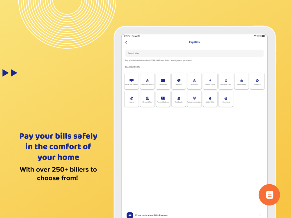 Explore the new PERA HUB Mobile App with a fresh look and feel! Apply for a virtual card FOR FREE to enjoy safe and secure remittance transactions on mobile anytime, anywhere! Pay your bills to over 250+ billers, transfer your funds to over 50+ banks and e-wallets, and many more all through the new PERA HUB Mobile App.