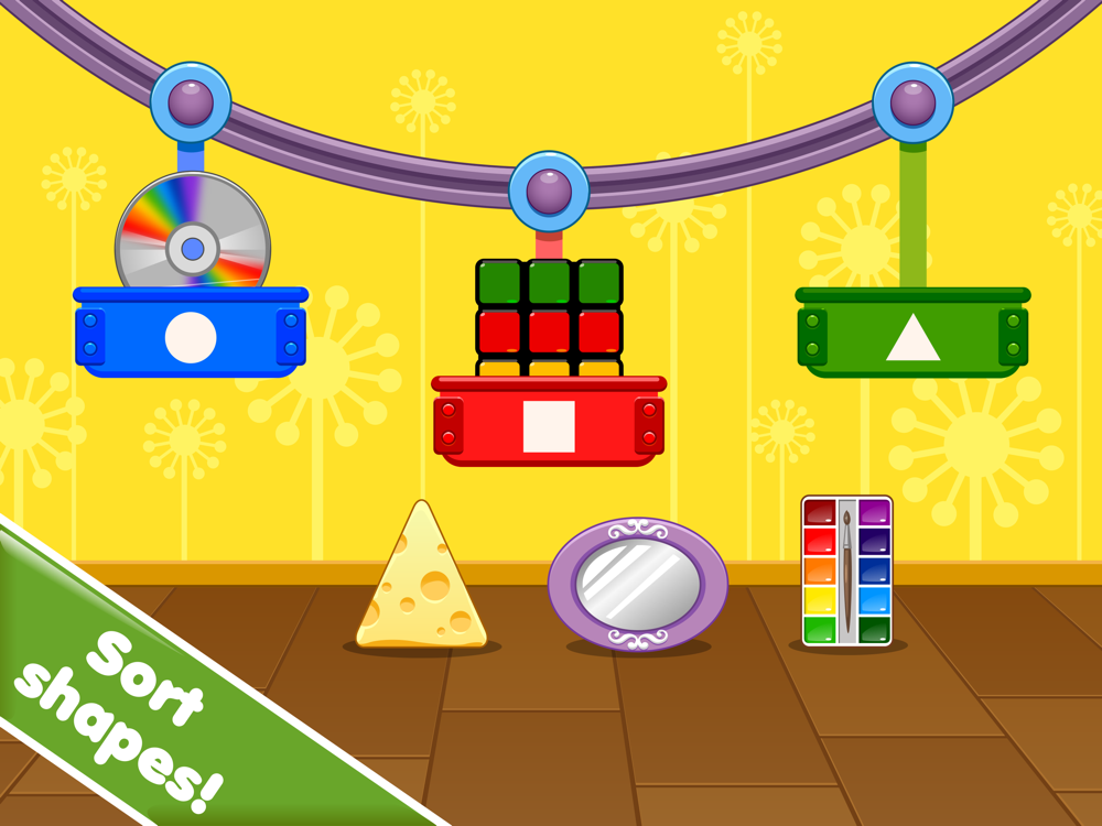 Sort – Kids load objects into the right cars of a Ferris Wheel. Each car has an image of a shape and the objective is to find an object that belongs in that car.