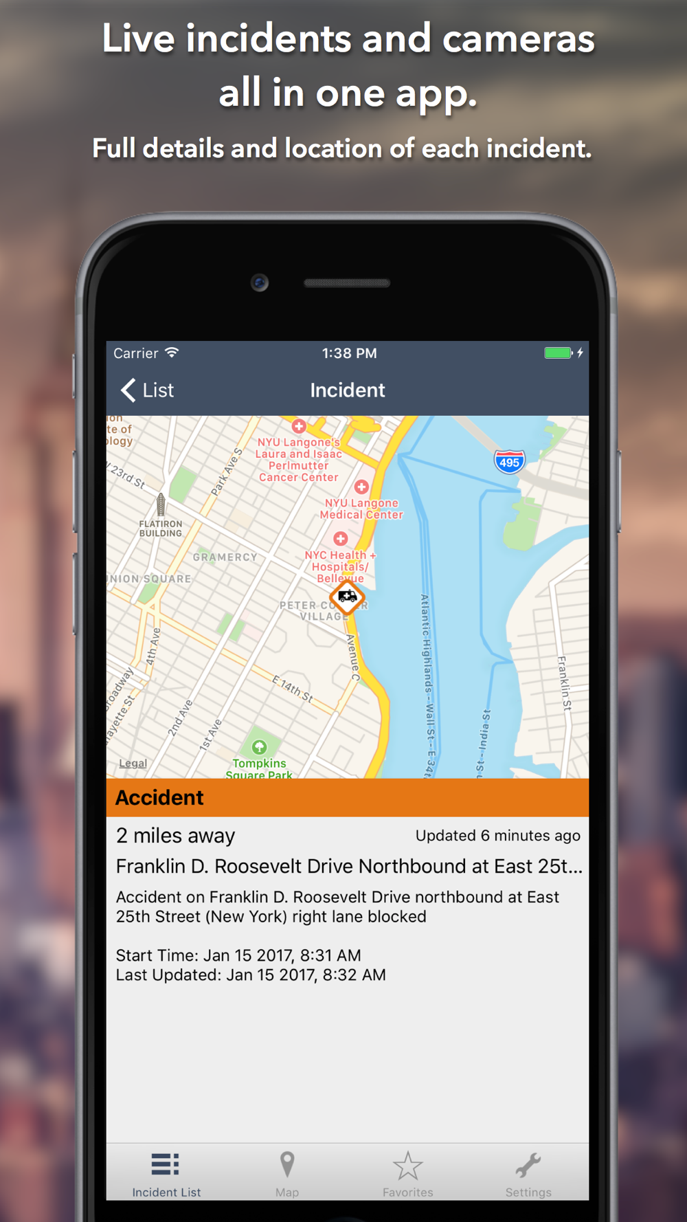 - Shows current incidents in order of distance from your current location (closest incidents are shown first).