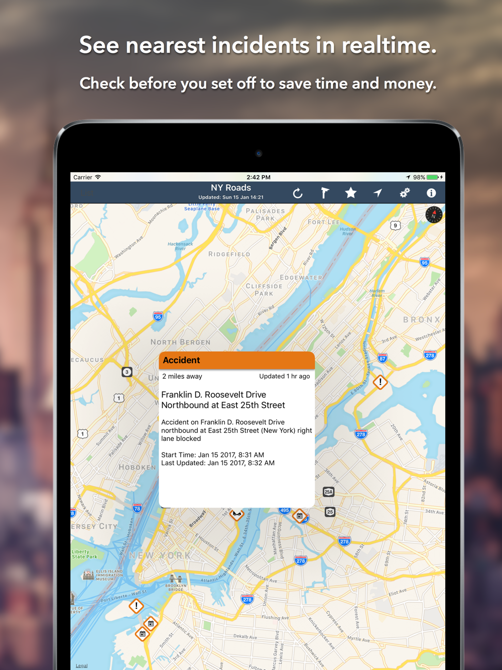 - You can quickly see the distance the incident is from you, the road name and the type of incident.