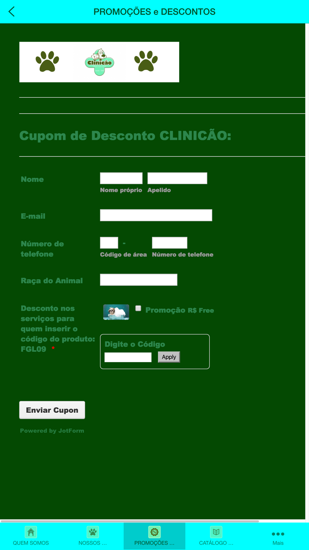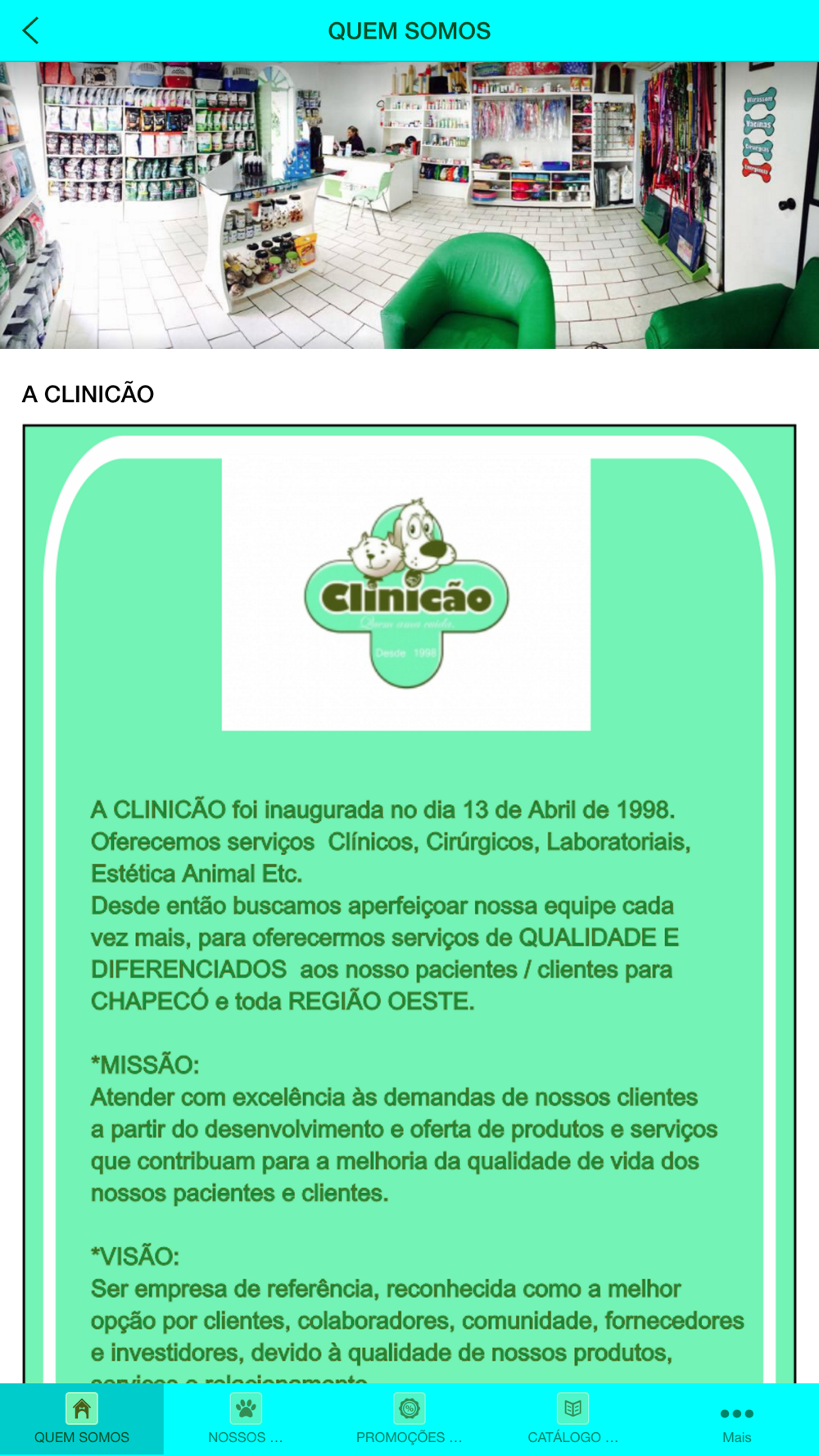 Aplicativo Institucional da Clínica Veterinária e PetShop Clinicão de Chapecó SC. Como chegar, quem somos, sobre nós, nossos serviços, promoções e descontos exclusivos, redes sociais, galeria de imagens, site, blog, pesquisas e muito mais informações.