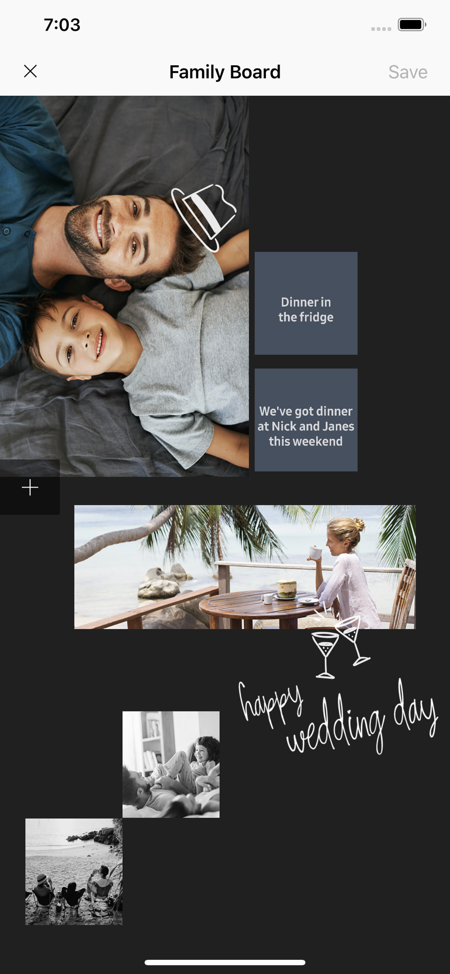 - Features like uploading pictures and videos can be found within the Family Hub device card
