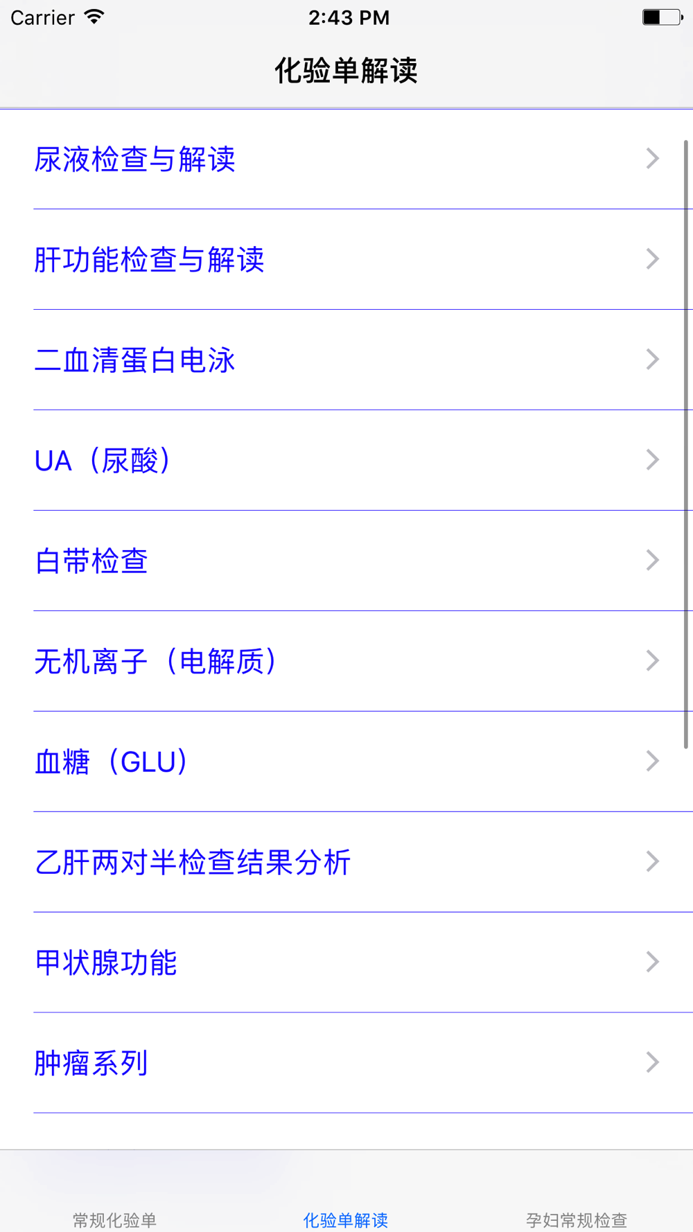 -----化验单解读是一款全面介绍医院化验单的App,内容全面的涵盖了各种常见化验单大全。