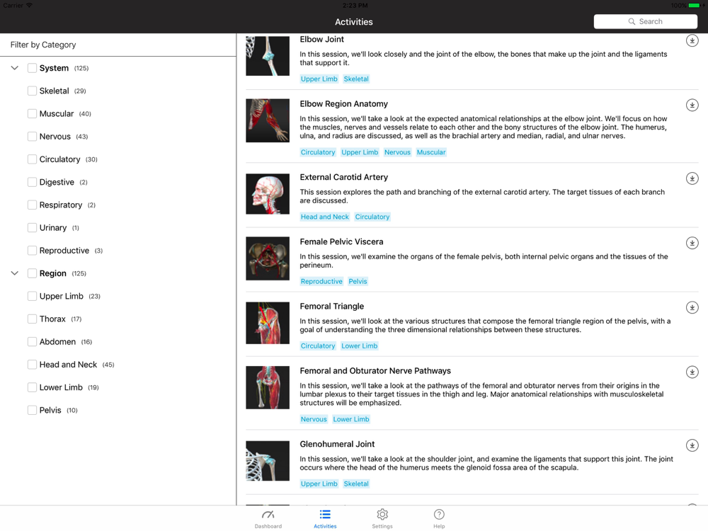 With the Gale Interactive Human Anatomy app, you have access to interactive sessions covering human anatomy taught in first and second-year college courses. Students experience guided interactive lessons aligned with course curriculum and use self-assessments to prepare for labs, discussions, and quizzes. Explore and manipulate the 3D models within the sessions by zooming, rotating, and pulling them apart, and gain context with reference and periodical content tied to the interactive sessions.