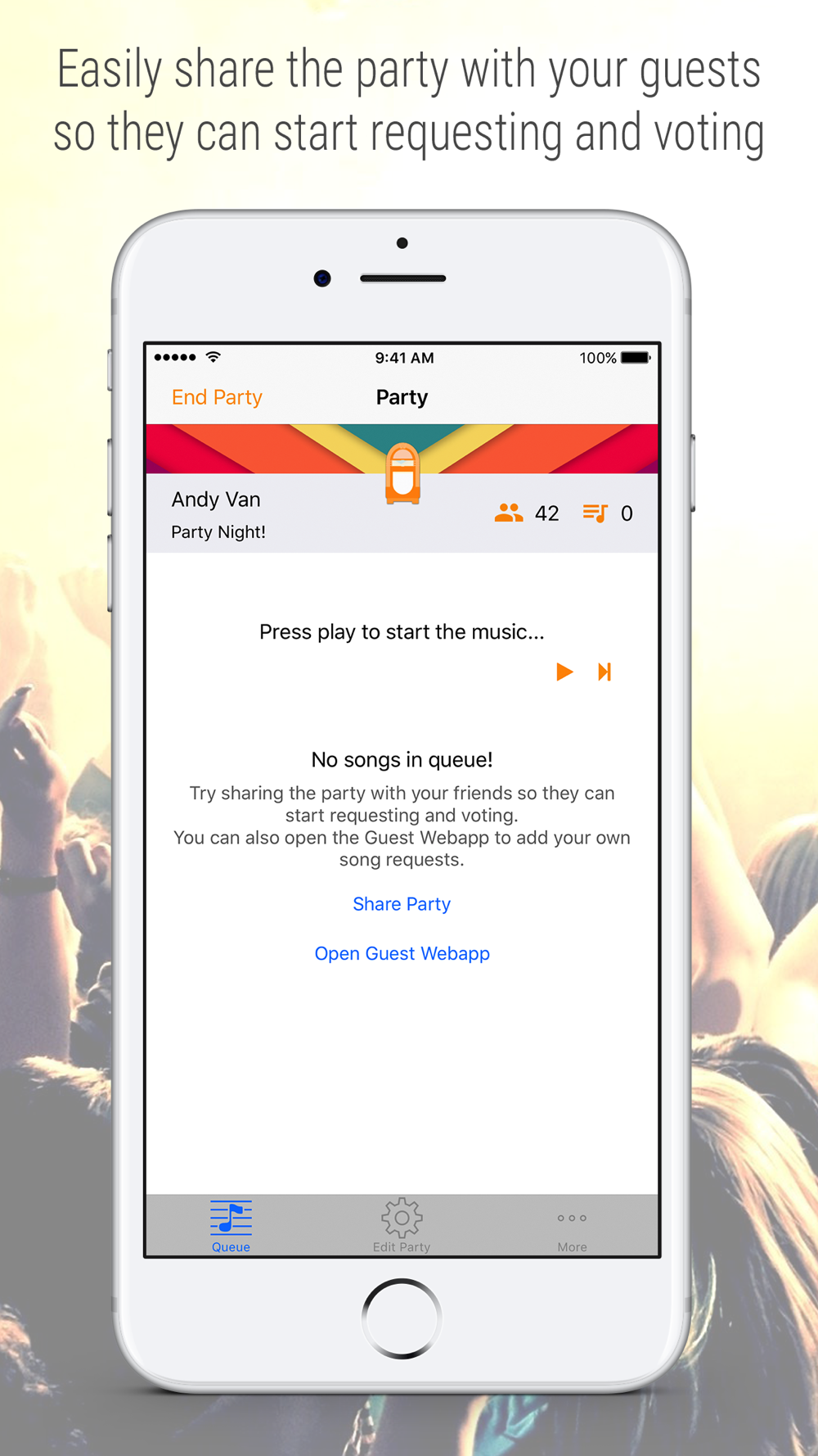 Create a party and share with your guests. They can now use their phone (without needing Spotify) to make requests from the millions of tracks available on Spotify, vote for the songs they like and veto the songs they hate.