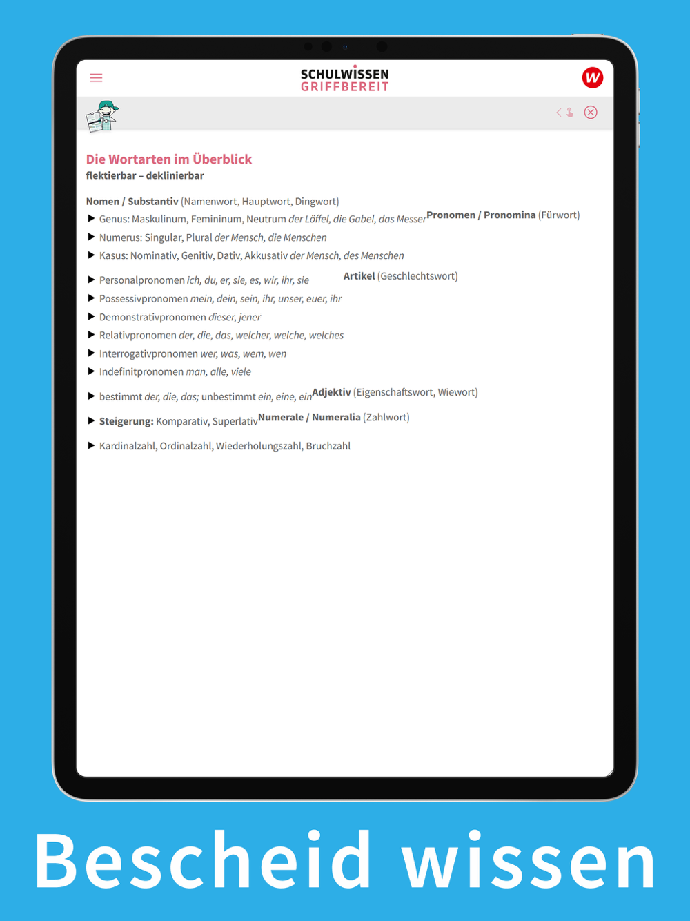 Diese App ist die optimale Ergänzung zur Buchreihe „Schulwissen griffbereit“. Zu allen wichtigen Themen der Sekundarstufe I werden jeweils auf einer Doppelseite Regeln anhand von anschaulichen Beispielen erklärt. Mit der Kombination aus App und Buch ist man so bestens für die nächste Klassenarbeit gerüstet.