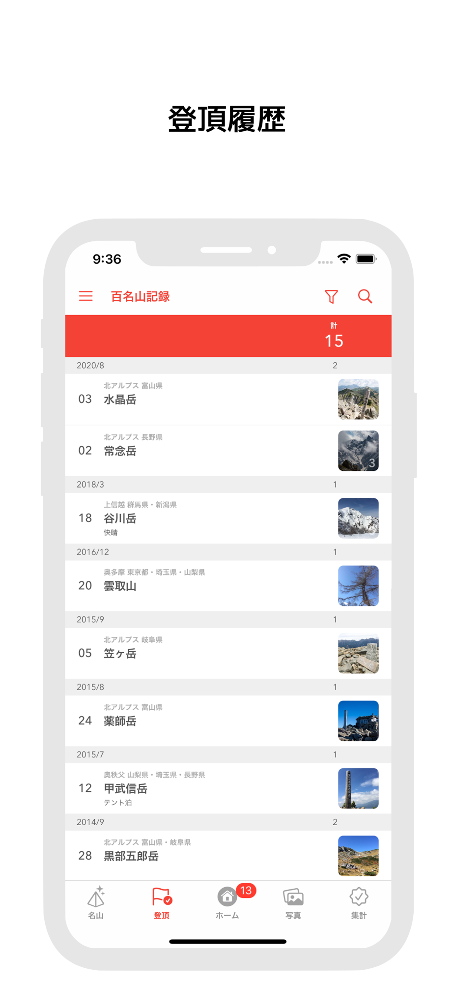 ・登頂履歴の記録は、登頂日、メモ、写真5枚が登録可能