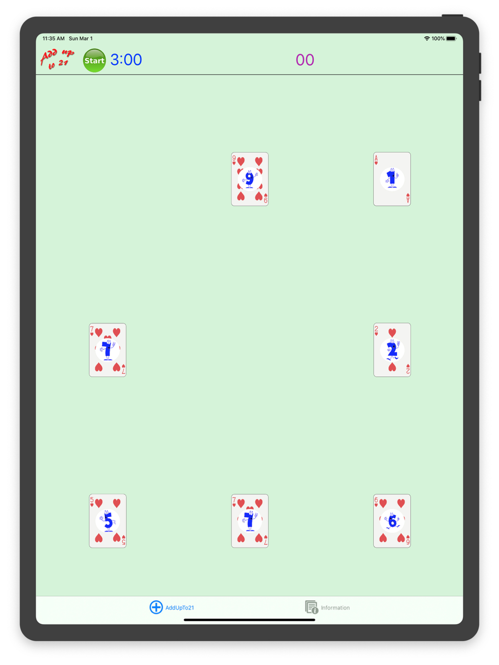 You are challenged to do this as fast as you can within 3 minutes: pick cards from the 7 given number-cards so that the sum of them is 21. Each number-card is a poker card with a value in the range of 1 to 13.