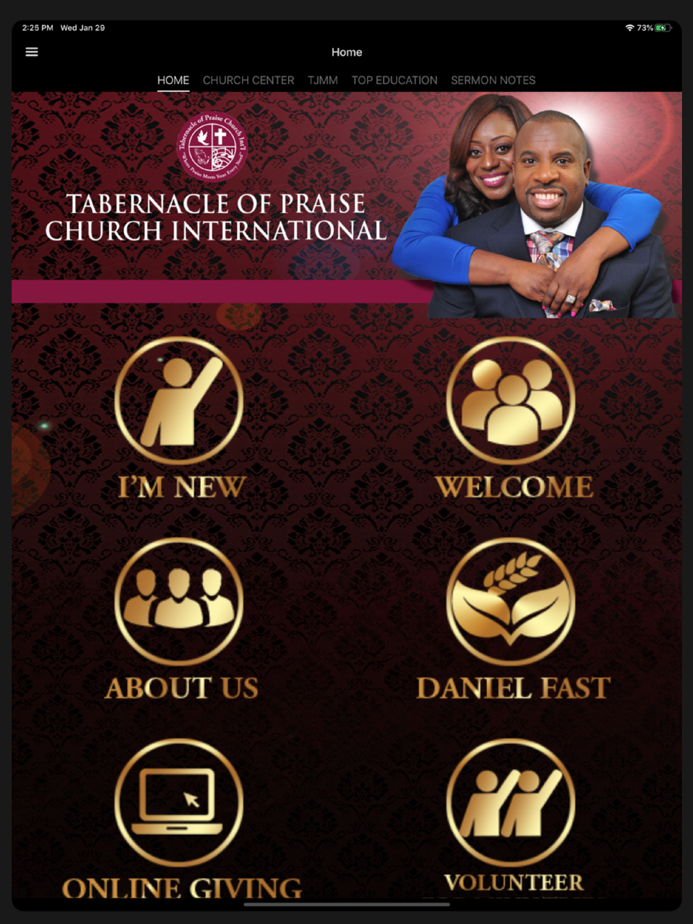 The mission of Tabernacle of Praise is to empower, equip, and enlighten all who come into the saving grace of Jesus Christ, through worship, discipleship, and impartation. We seek to spread the Gospel of Jesus Christ using all the resources that are available to the body of Christ so we invite you to download our app to help us connect to you and better minister to your needs. You’ll find many helpful resources as well as view our services live or Video On Demand.
