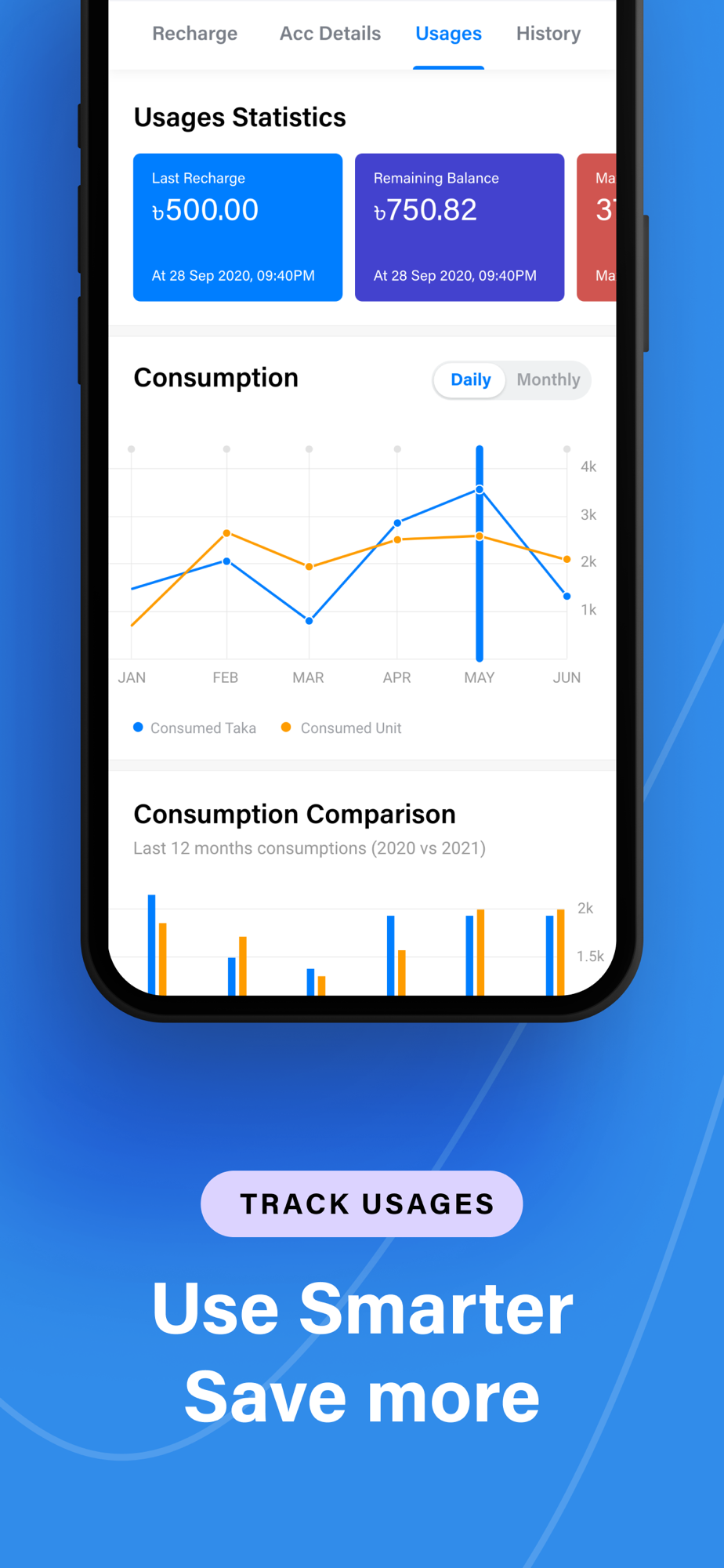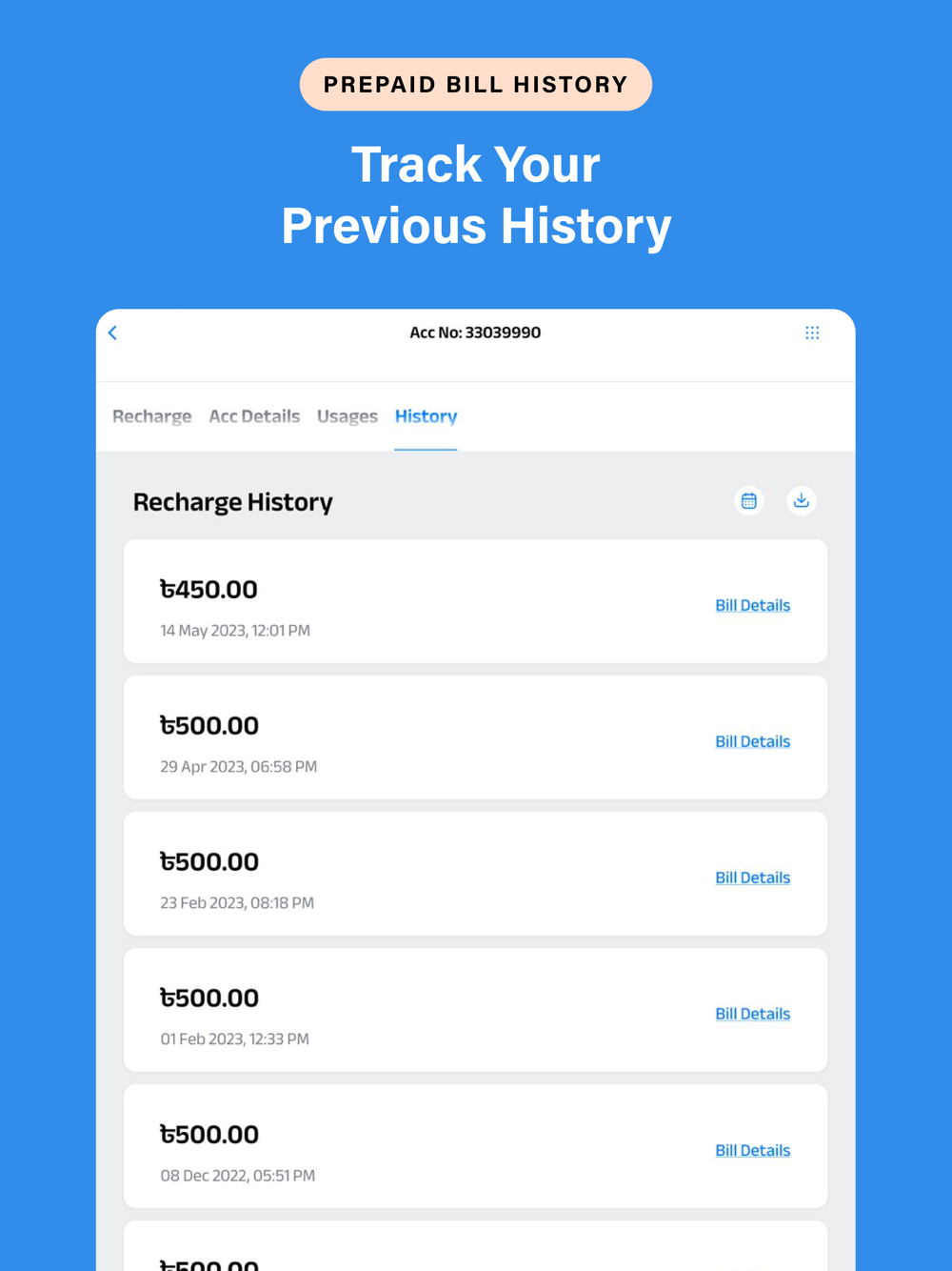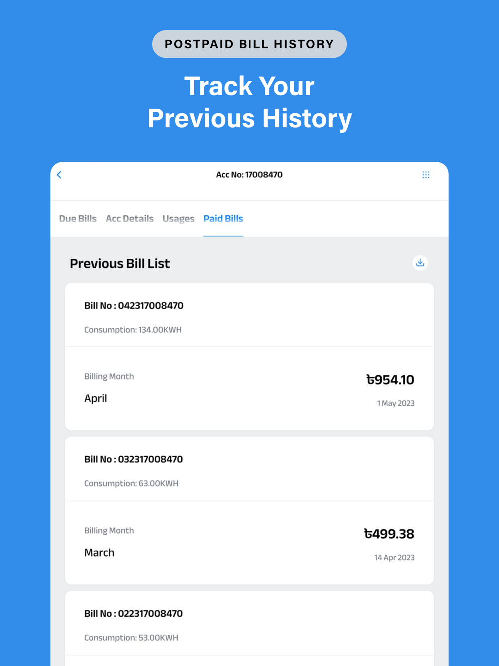 View both Postpaid and Prepaid DESCO Electricity bills through one app and pay your Postpaid due bills and recharge Prepaid account from the application by only a few taps.