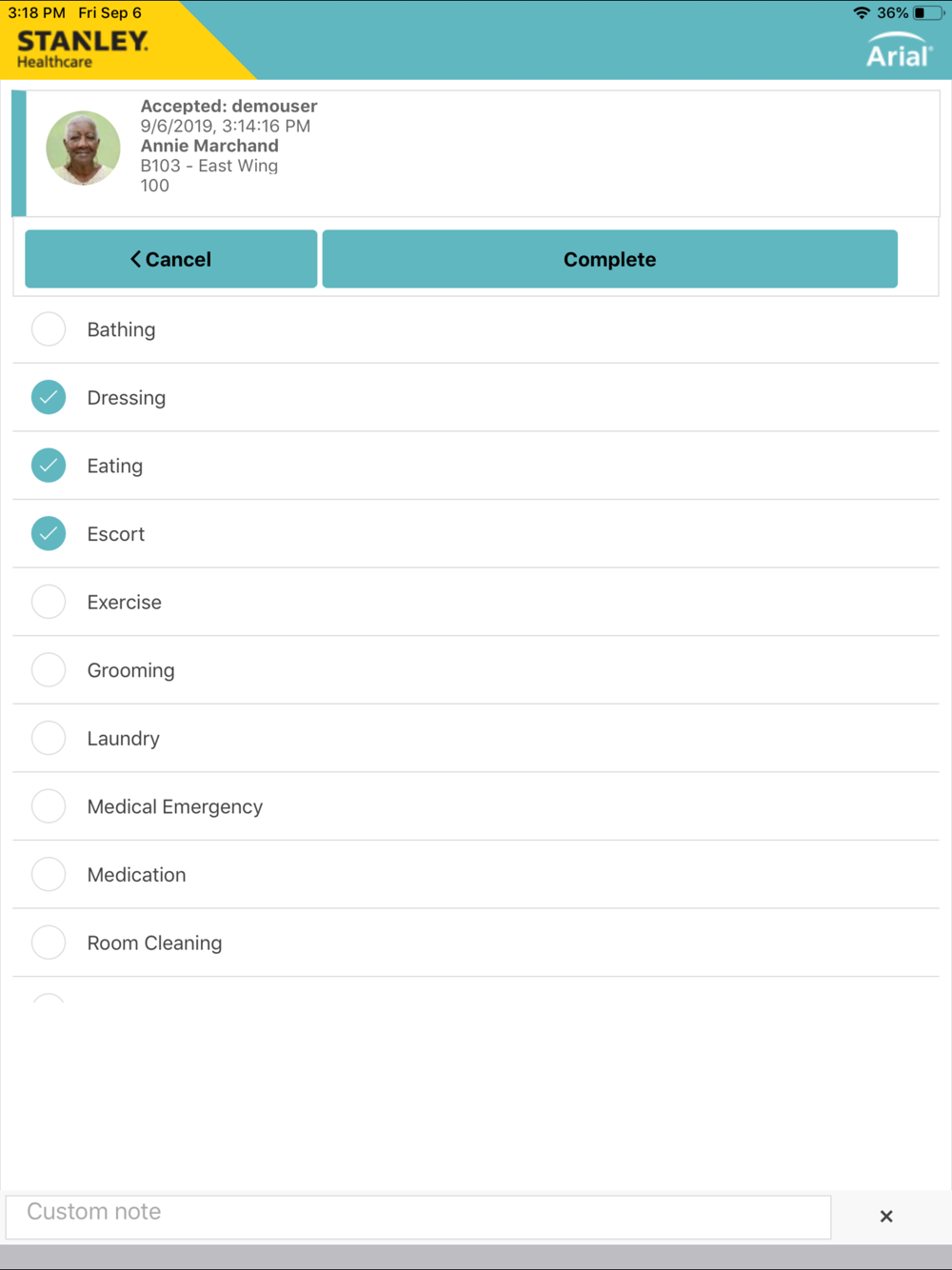 • Alarm Completion – caregivers end the encounter by pressing a “Complete” button, which saves the alarm notes and captures the actual encounter time with the resident