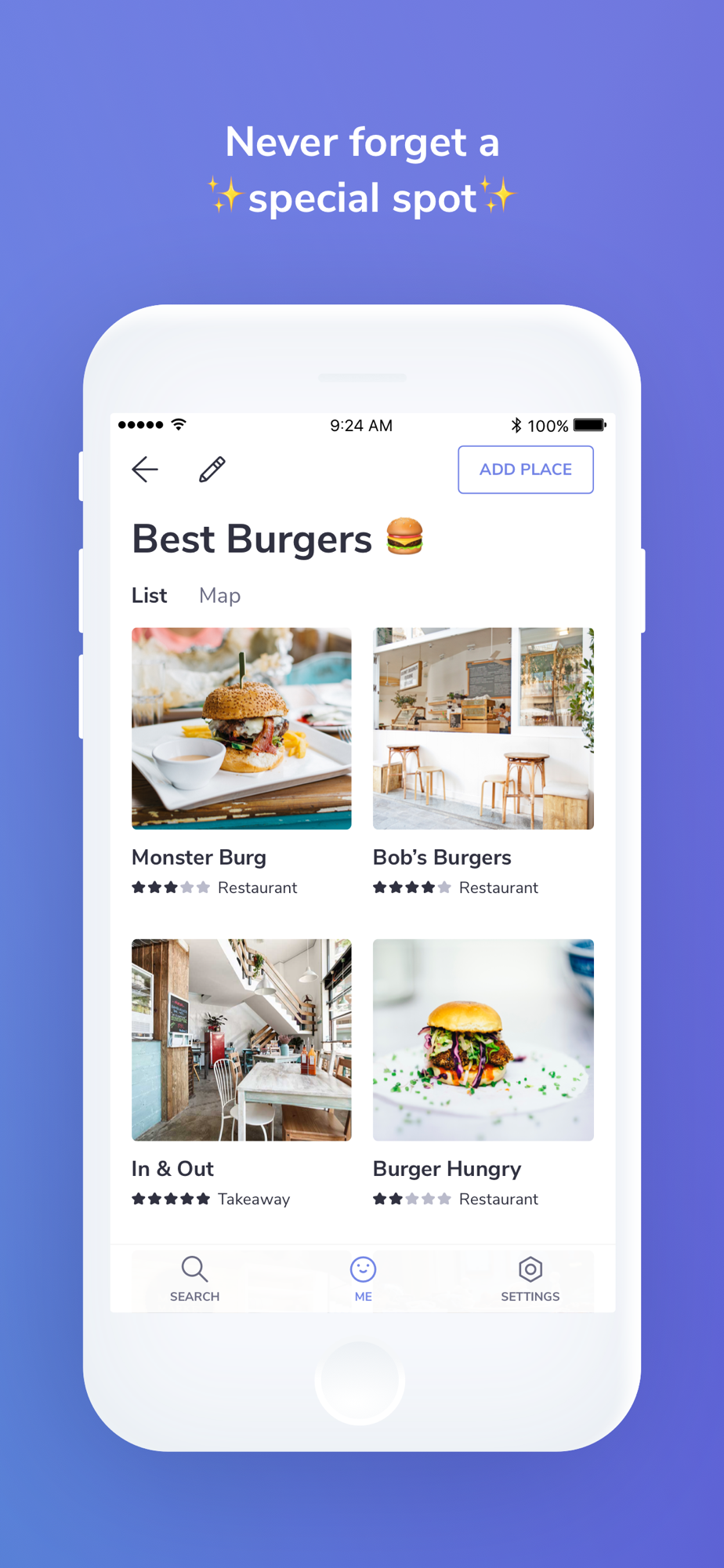 Organize in customizable lists the places you like the most. Create new lists or edit the existing ones and save as many places as you want.