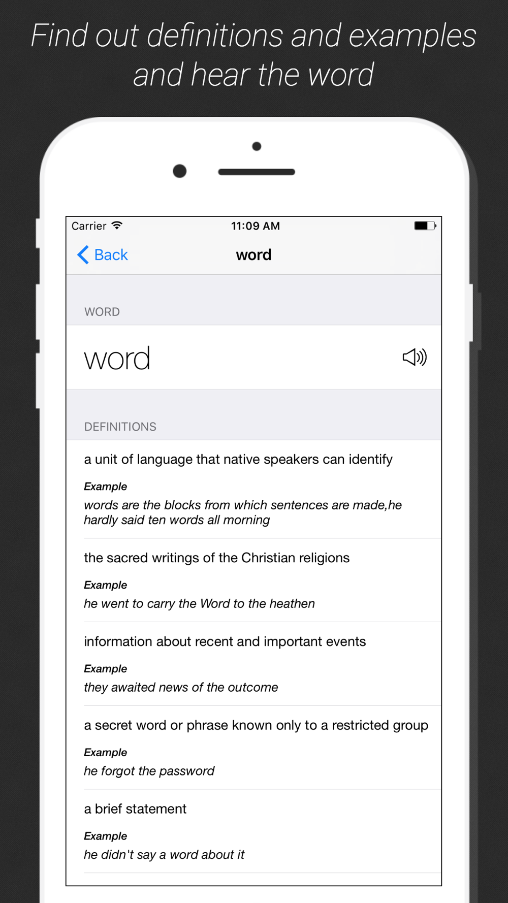 In addition to learning definitions and examples, you can listen to the original pronunciations of the word from Youtube videos (requires internet connection).