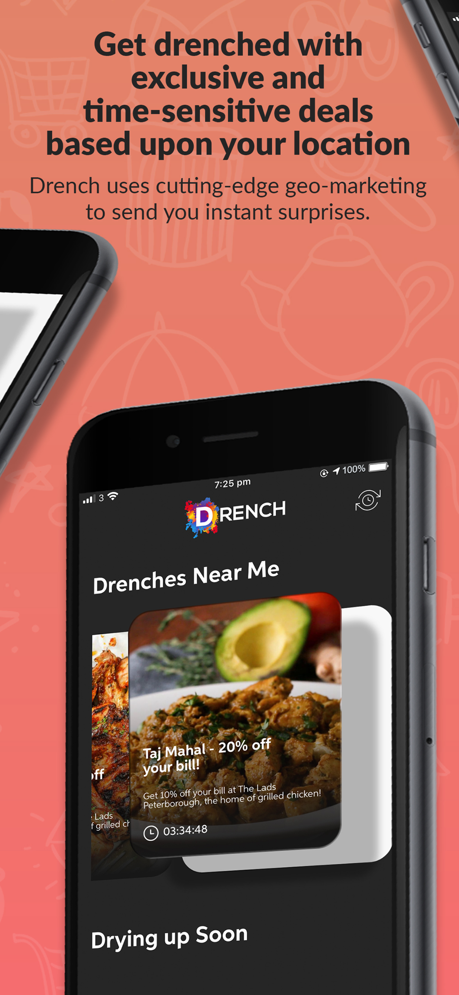 With your permission, we send you geofenced offers (drenches) via push notifications, in real-time. BUT, you have to claim these drenches before they dry up and disappear!